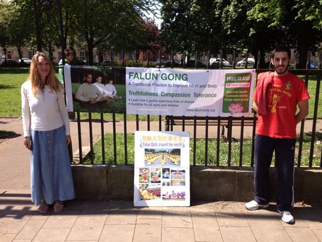 ![]() 在英国布里斯托刚刚开始修炼法轮功的西班牙青年费尔南多(右)几乎每周都到当地的炼功点炼功和弘法。 |