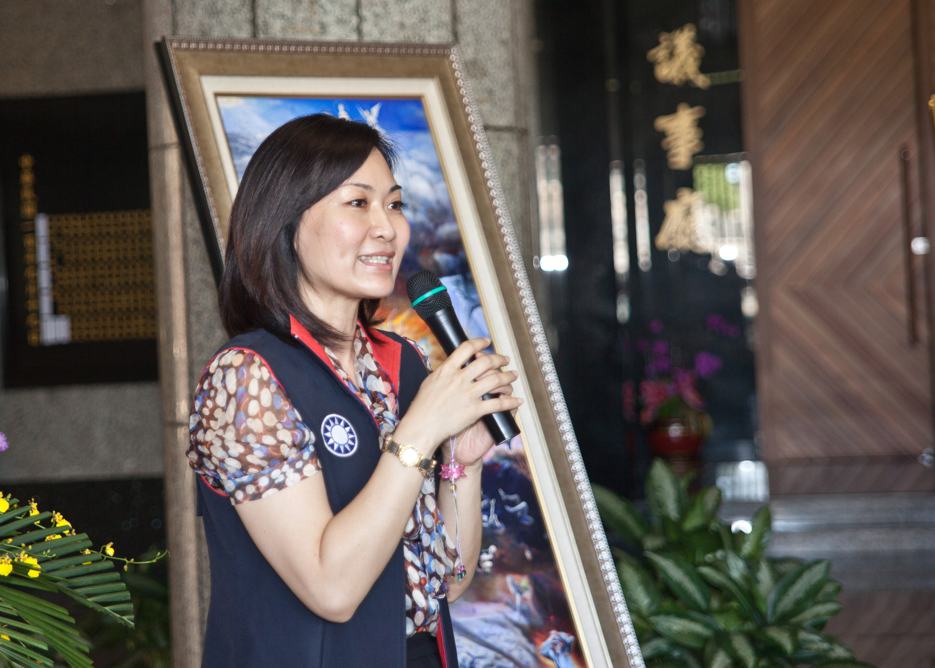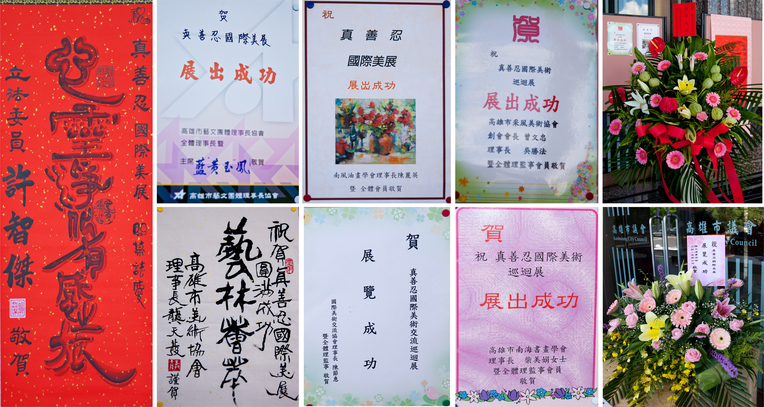 图4:多个艺术界画会理事长、政要发来贺词和鲜花,祝贺真善忍美展在高雄市议会展出成功。