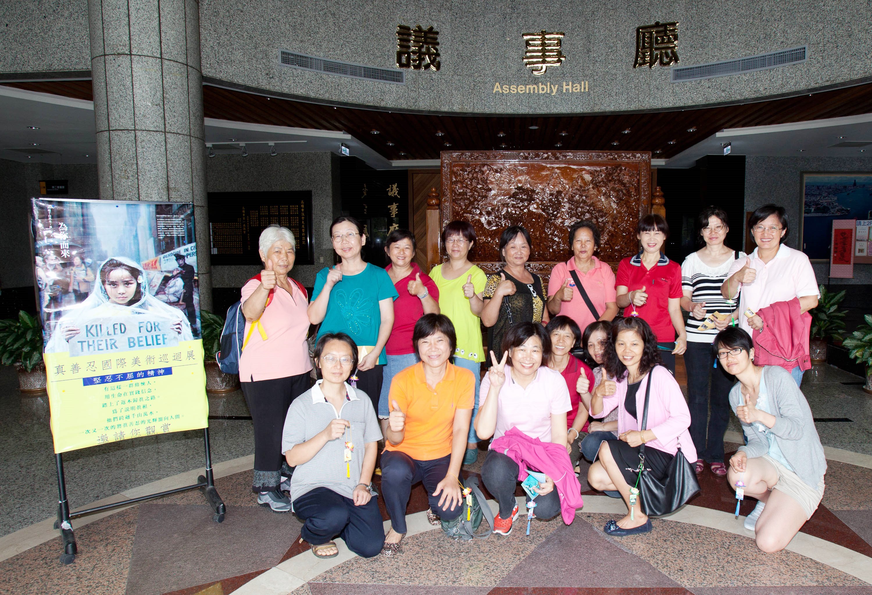 图 4:市议会真善忍美展,凤山社区服务团团员也相邀前来参观美展,团员竖起大拇指说赞。