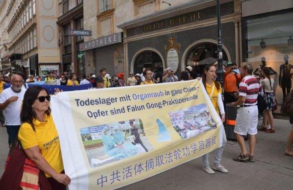 游行于下午一点开始。浩浩荡荡的队伍由白衣方阵的学员拿着被中共迫害致死的学员遗像,各种法轮功真相横幅方阵,花车上展示法轮功五套功法,以及揭露中共活摘器官演示组成,在当地警察的护卫和配合下从瑞典广场(Schwedenplatz)出发,一路经过繁华的市中心商业区以及著名景点,并环绕中国市场的主要街道,最后行至史蒂芬广场的信息台,历时将近三个小时,吸引了大量游客以及街道两旁的商家前来了解法轮大法真相。很多人从学员手中接过传单,认真阅读。