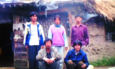 ![]() 韩宝贵(前左一)一家在草房前。 |