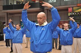 二零一三年七月二十日,澳洲布里斯本市中心的布里斯本广场上处处可见身着黄色T恤的法轮功学员,有的在炼功、有的举横幅、有的在发资料和征签。