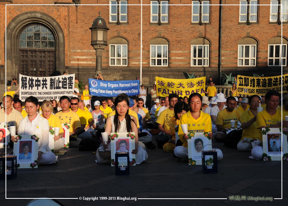 刚刚结束在哥本哈根市中心大规模环城游行的近千位法轮功学员直接在市政厅广场上摆出了声势浩大的阵势,站在整个队伍最前面的天国乐团气势如虹,轮流演奏“法轮大法好”、“法轮圣王”、“法正乾坤”、“法鼓法号震十方”、“送宝”、“欢乐颂”、“阿依达”等八首乐曲。法轮功学员举起的众多横幅一层一层地排列,汇成一道真相长城,横幅上的中文、英文、丹麦文都引人注目、直击人心,其中最重要的文字包括:“立即结束迫害法轮功”、“解体中共 结束迫害”、“天灭中共”、“退出党团队保命保平安”以及“法办江泽民、罗干、刘京、周永康”等 。