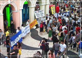 二零一三年七月二十日,澳门法轮功学员下午在中区步行街进行“反迫害集会”,抗议中共对法轮大法进行十四年的迫害,并向澳门市民及游客揭露中共对法轮功学员进行邪恶迫害的真相,同时帮助中国民众现场进行退出中共党、共青团及少先队组织。