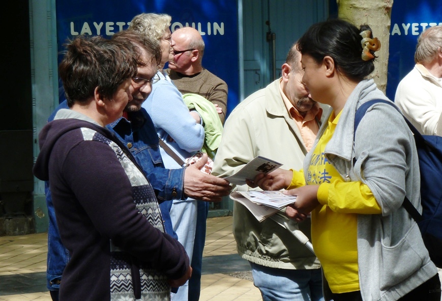 “你们知道吗?你们是主持人唯一赞扬的游行方队,他一直在夸你们,你们表演得真好!”两个人赞不绝口,感谢天国乐团带给他们的精彩表演。得知法轮大法学员每周在巴黎集体炼功,他们很高兴,表示一定会到炼功点看看。