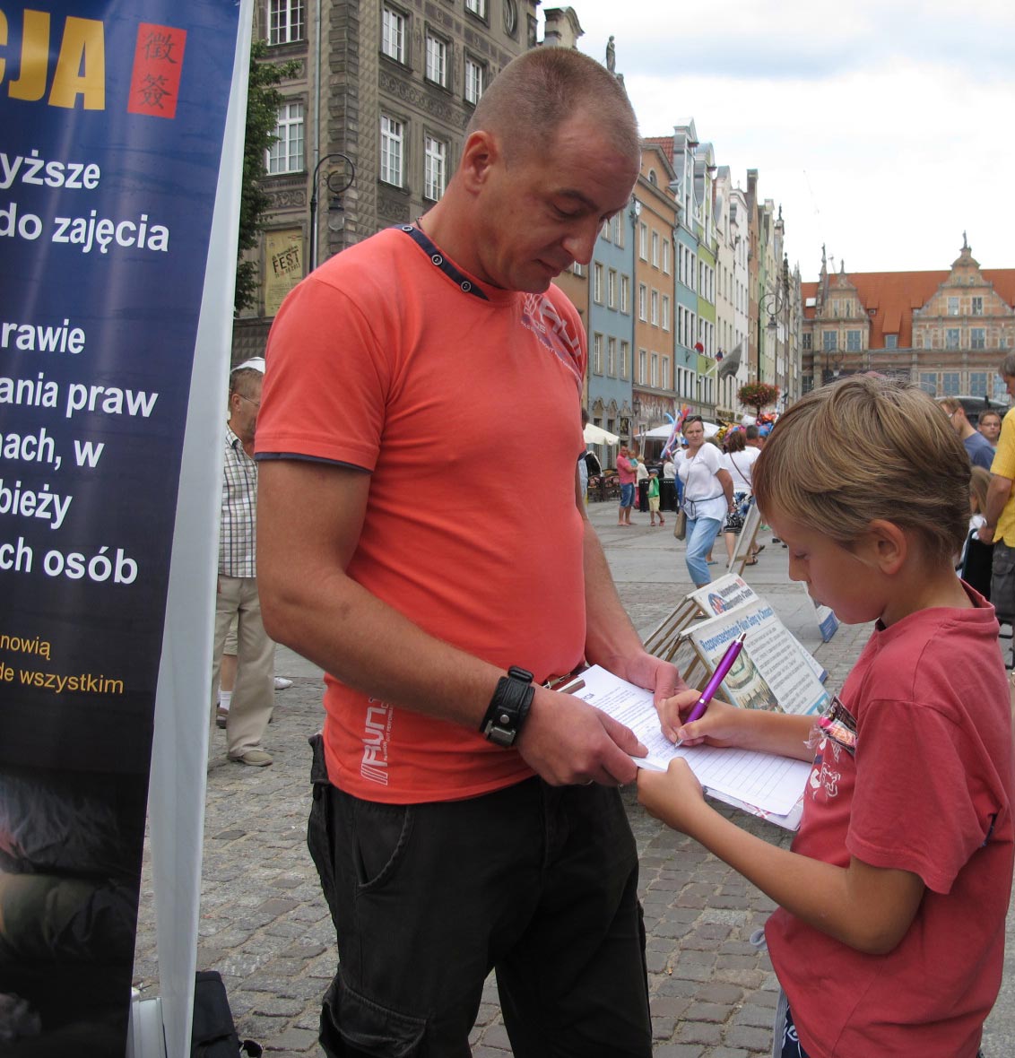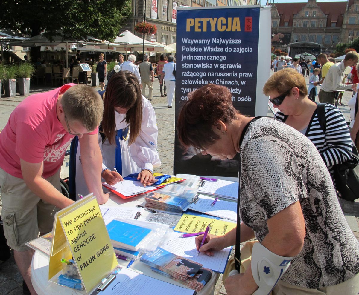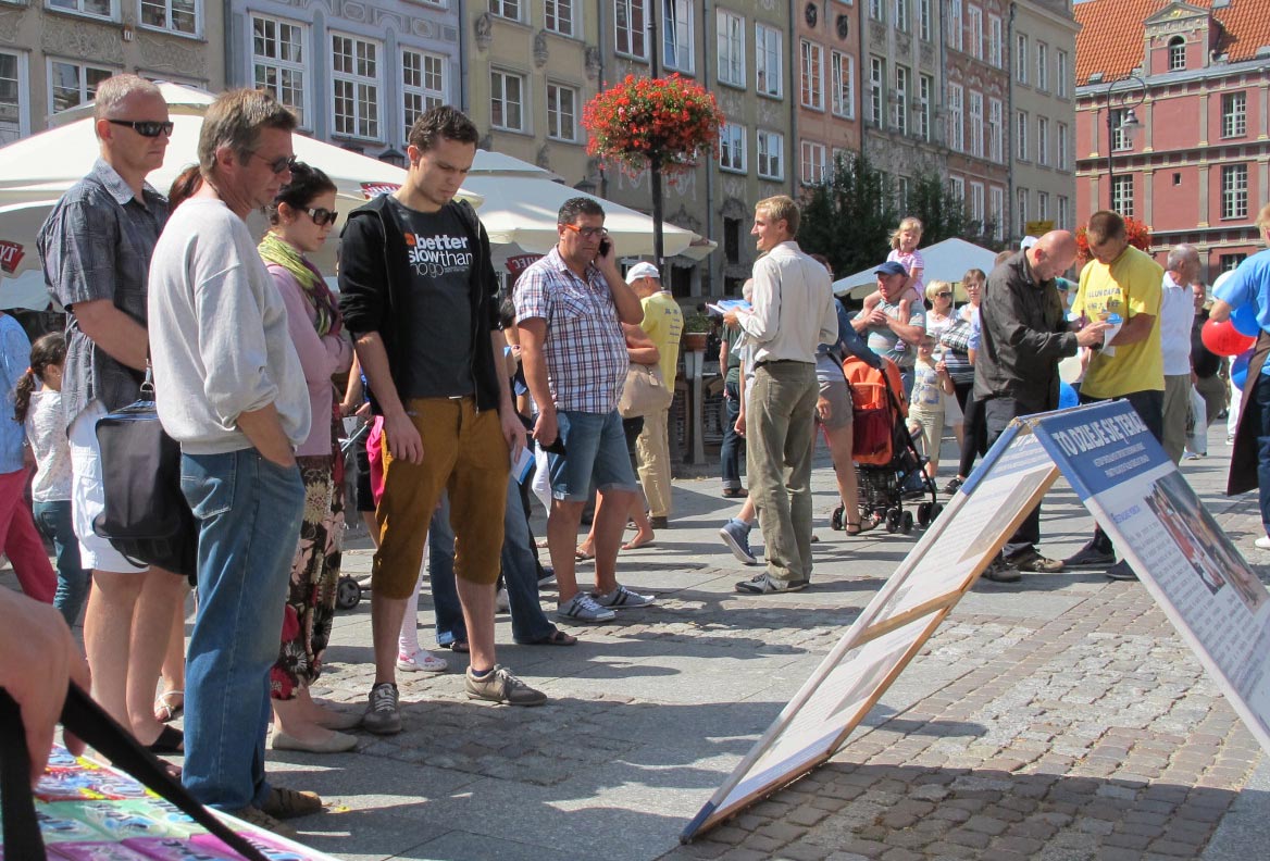 一位波兰男士和全家在格但斯克古城散步,看到法轮功真相展板和征签说明后驻足良久,他对法轮功学员说:“我在卫星电视中听到过对这事情的报道,中国共产党对法轮功修炼者迫害到活摘器官这一步,真叫人不寒而栗。这世界上怎么会有这么可怕的事情,怎么干得出来,知道欧洲发生过战争吧,这比战争要严重多了,比希特勒还要坏。我签字抗议中国共产党,我们全家都签字,一定要制止这种恶行。”