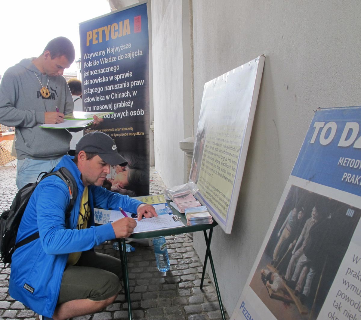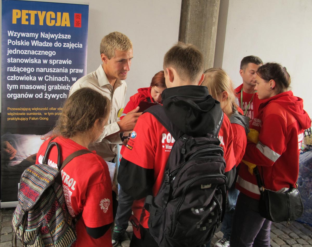 来波兰旅游的两位德国女士看见法轮功学员后,拿出钱要资助法轮功学员的活动,其中一人用英语说:我看不懂这个展板上的文字(指波兰语),但是(你们体恤衫上的)“法轮大法”字样我看懂了,在德国我们就知道法轮功真相。”法轮功学员非常感谢她们的好意(但婉言谢绝了金钱),同时拿出英文版征签表格告诉她们:“这是由‘反强摘器官医生协会’(Doctors Against Forced Organ Harvesting,简称DAFOH)发起的全球联署行动,呼吁制止中共活摘器官,如果你们能在这上面签名,我们会非常感谢你们的正义支持。”这位德国女士看了征签表格上的详细说明后表示:“我就是医生啊,为此而签名是我义不容辞的责任。”另一位女士说:“我不是医生,但签名也是必须的,应该的,毫无疑问的。”二人都在征签表格上签上名,在走前还不断地对学员说:“祝你们成功,你们一定能成功。”