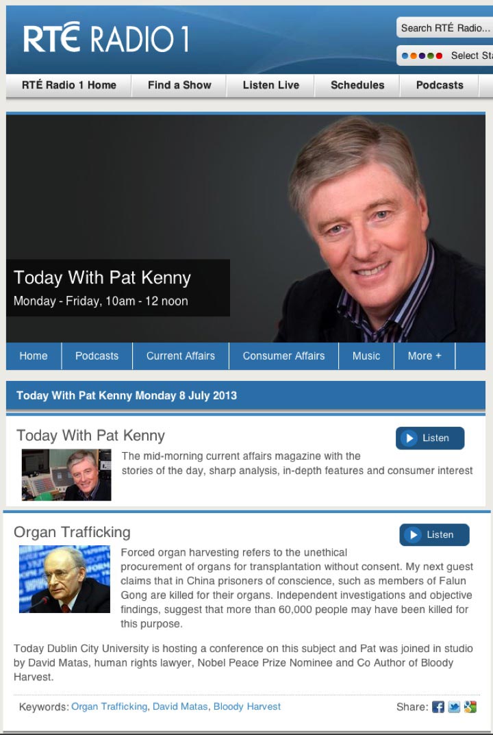 七月八日,人权律师大卫•麦塔斯接受了爱尔兰国家电视台RTE采访,采访麦塔斯的是RTE电台晨间黄金时段脱口秀节目“Today with Pat Kenny”。节目主持人派特•肯尼(Pat Kenny)在采访中,围绕法轮功真相以及中共活摘器官罪行对麦塔斯提出大量问题。麦塔斯列举了证实中共活摘法轮功学员器官罪行众多证据中的三点: