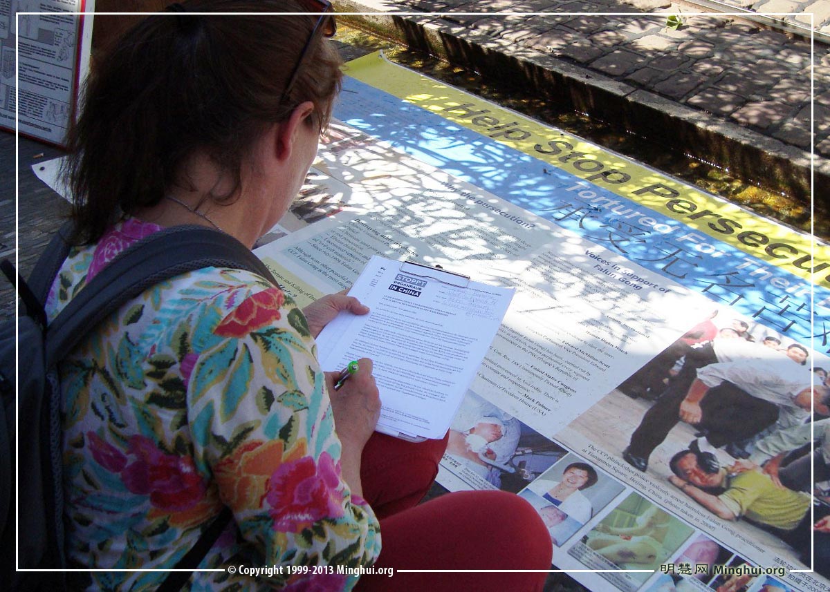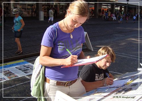 一位德国中年妇女准备去购物,看了递给她的真相资料后听马上说:“我签,让我再仔细看看是什么内容。”然后拿起表格说:“我一定要签,把人当作牲畜一样地随意宰割,这不行!”在填写邮件地址时,她认真地解释道:“要实事求是,我是有邮件地址,可几年都不用了,密码都忘了,给了也白给,就不填写了,这么严肃的事情我们要慎重些。”