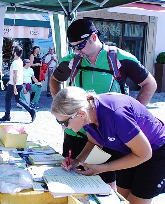 Jirkal女士是奥地利一家妇女俱乐部驻萨尔斯分部的主席。她直接来到了法轮功学员的信息台前签字。她表示她听说过法轮功被中共残酷迫害的真相,所以她特地前来签名支持制止迫害。她留下了她的名片,让法轮功学员联系她,并把网上征签的网址给她,她要把中共活摘法轮功学员器官的暴行告诉她在全奥地利的五百名同事,让他们在网上签字。