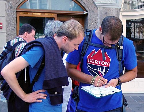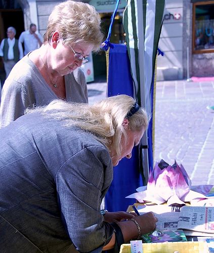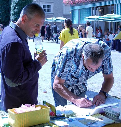 二零一三年八月二十四日,奥地利部份法轮功学员在艺术节的举办地,萨尔斯堡老城举行讲真相活动,揭露中共迫害法轮功学员,以及活摘法轮功学员器官的反人类罪行,同时征集签名呼吁共同制止迫害。