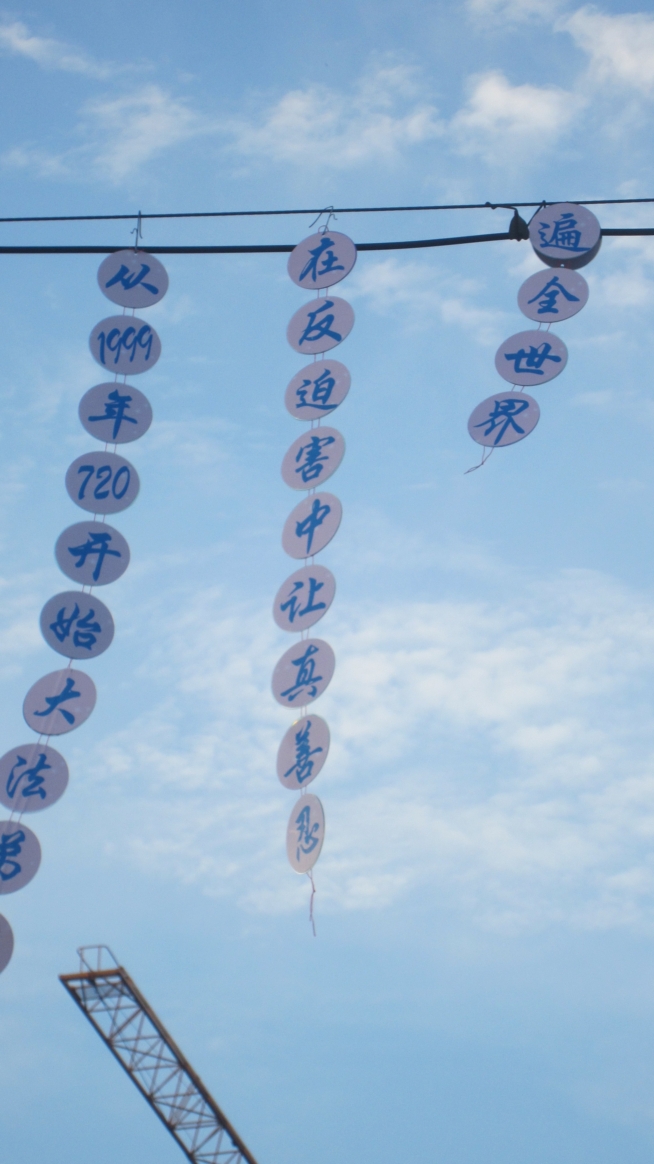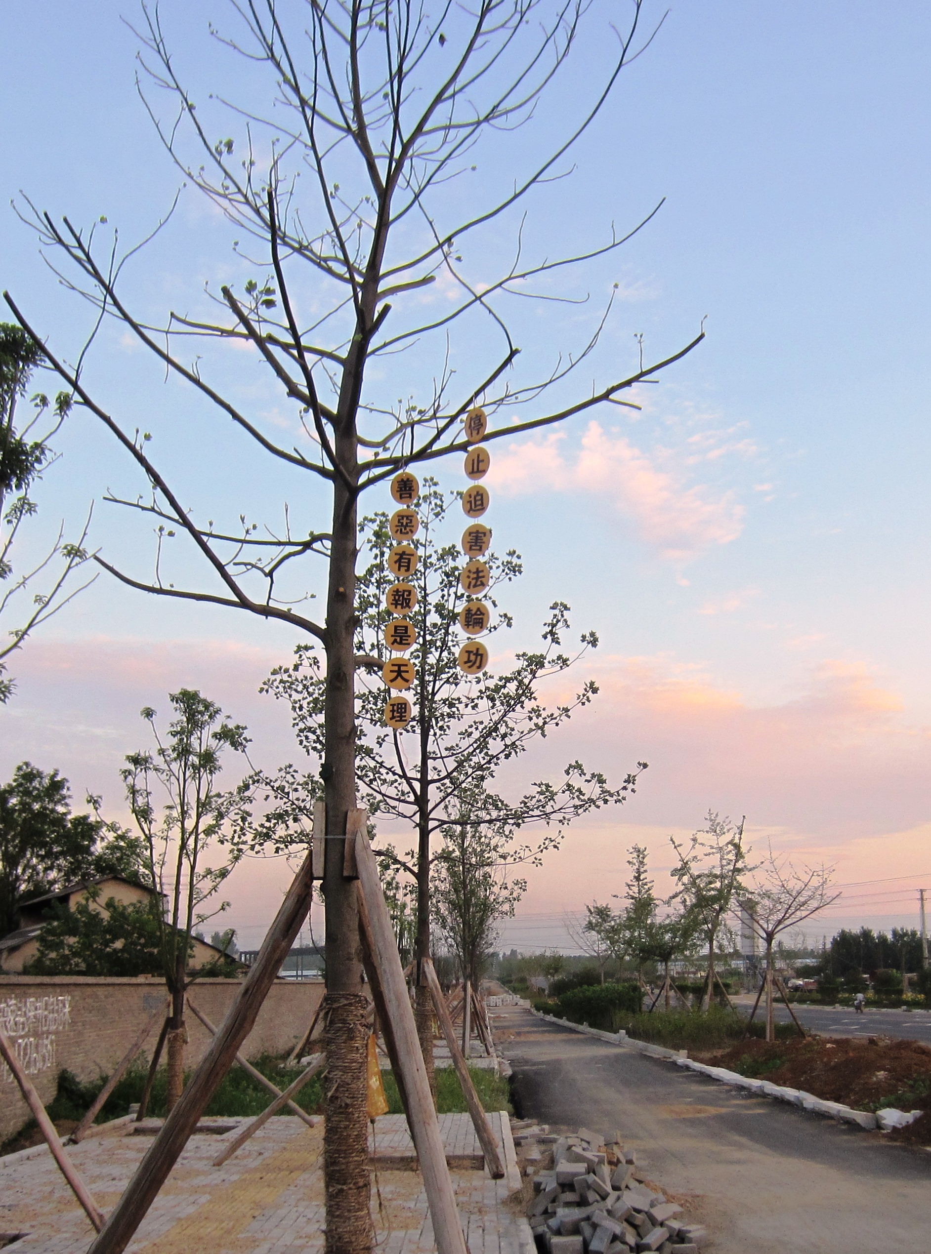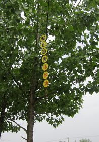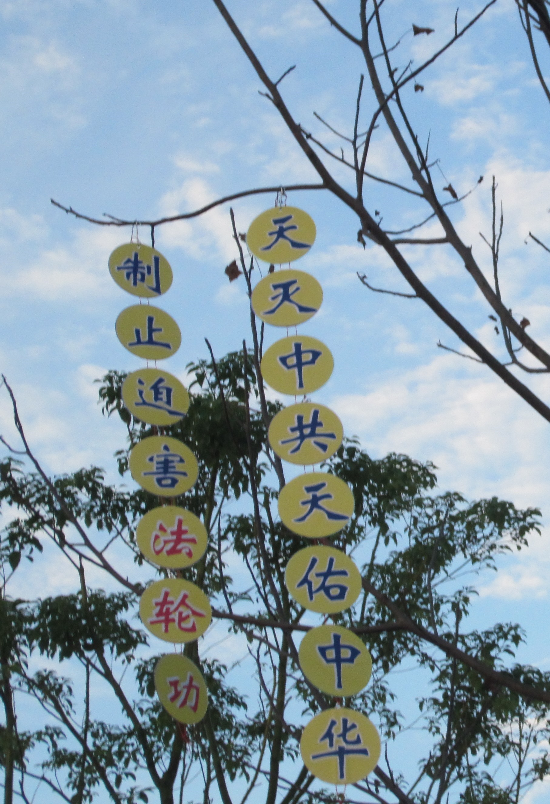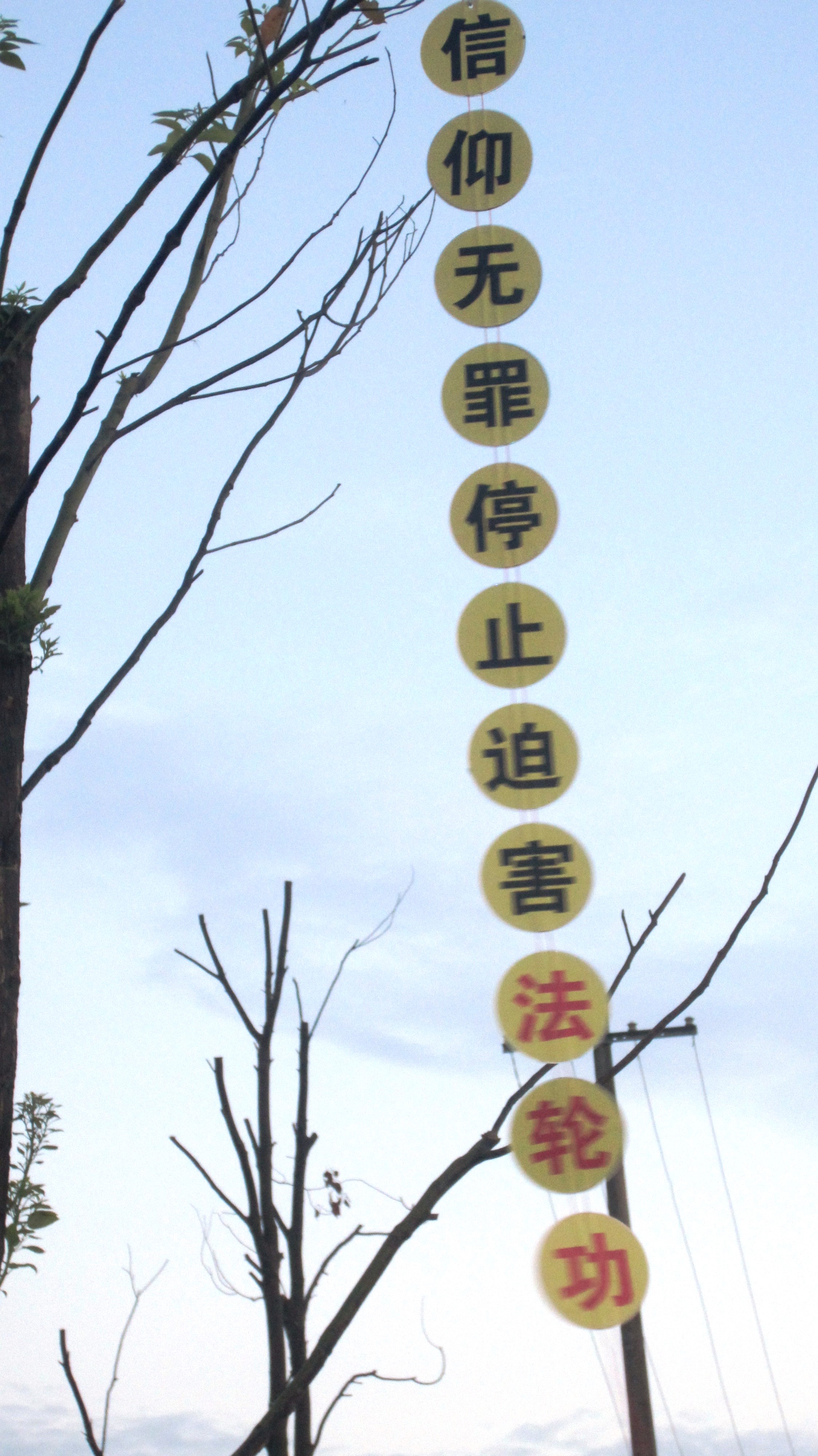 选出一些现场照片与大家共同分享救度众生的喜悦。其中,有今年过年期间大法弟子给家乡众生拜年的,还有四二五、五一三、七二零期间悬挂的,这些标语都是利用废光盘制作的。也希望其它地区的大法弟子,也不要丢弃制作真相光盘时产生的废盘。把这些废盘收集起来吧。变成真相标语,变成真相光盘画,大家在制作与悬挂期间也出现了很多神迹的小故事,待另文一一与大家分享这些神奇的小故事吧。