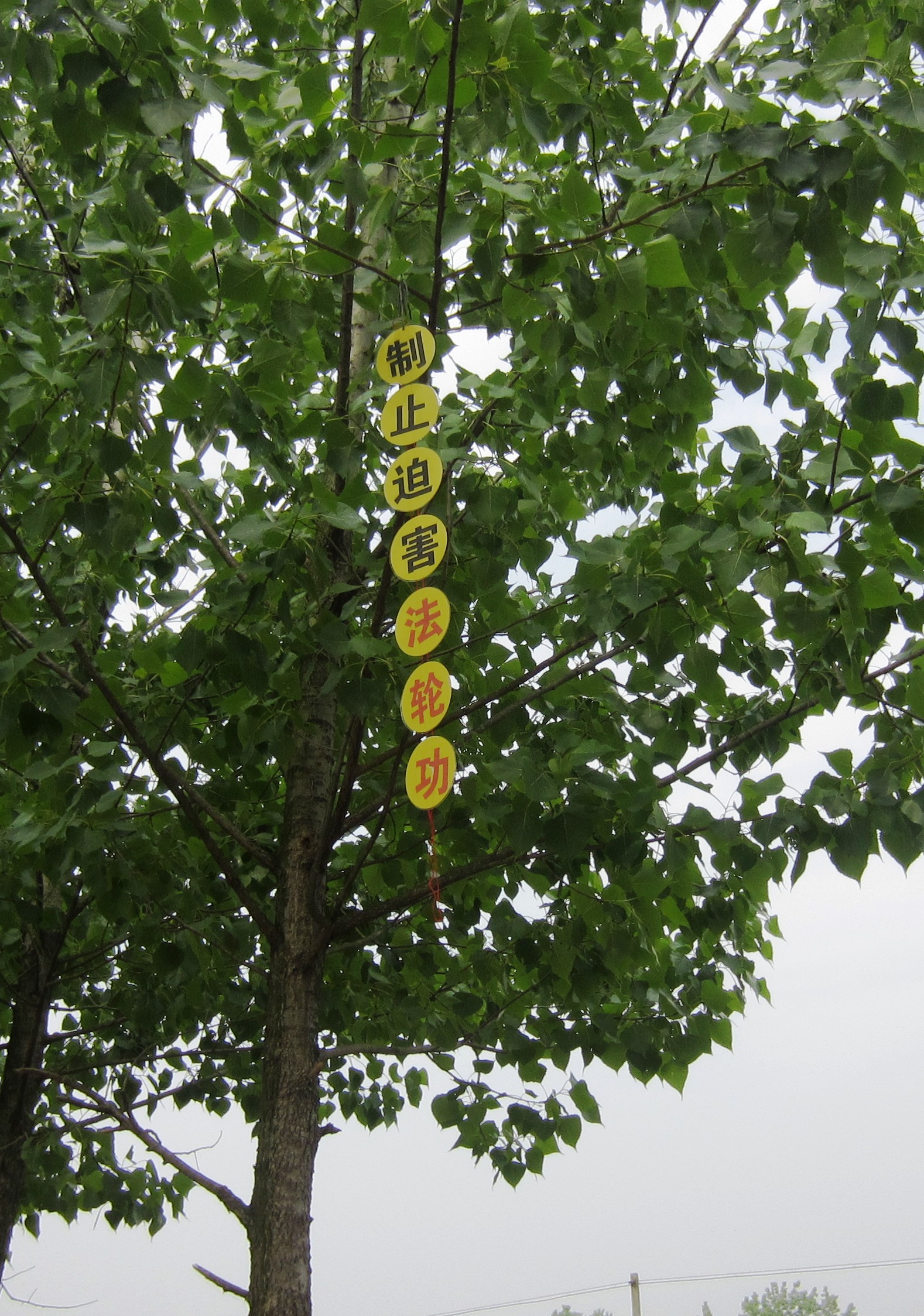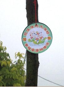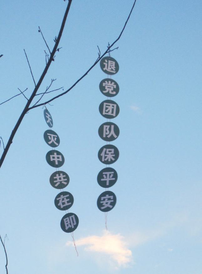 还有,今年六月中旬的一天,湖北省的大法弟子们把“天灭中共在即,退党团队保平安”的标语,挂在一家银行前面的大树上。非常醒目,吸引了很多人观看,明白真相的世人告诉银行工作人员及围观的群众,说:谁也不允许摘下来取走。就这样这条标语保留了十几天,一直到中共恶党生日那天,才被偷偷摸摸摘掉了。