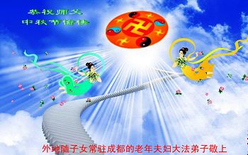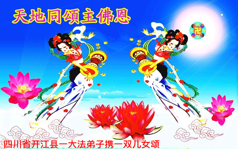 我们两个家庭都是法轮大法的受益者,我们期盼李大师快快回来。现在中国大陆是天灾人祸,邪魔横行。我们盼望“佛光普照,礼义圆明。”