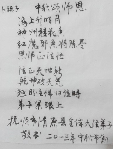 为救大穹下凡界 佛恩浩荡天地间 中秋月圆望师归 神州子民叩首前