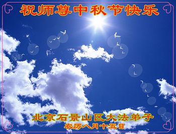 我是北京一名中年大法弟子,修炼15年了,身心受益。又一年中秋节到了,每逢佳节倍思亲,师父给予了弟子和家人新生,师父是弟子在世间最亲的人,弟子向伟大的师尊问好!我要更加勇猛精進,做好三件事,和同修配合多救人,不辜负师父的慈悲苦度,圆满随师还。我代表明真相、已三退的家人向伟大的师尊问好!