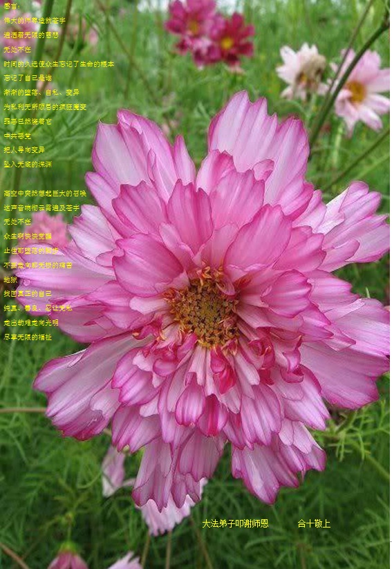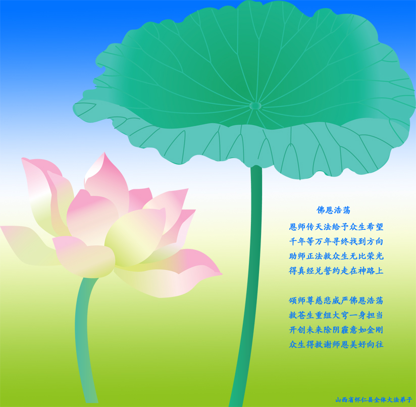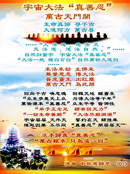 用尽人间、天上的所有语言也道不尽师尊的洪恩!捧出宇宙中的一切珍宝也报答不了师尊为众生的付出!师尊只要我们正法修炼的正念,师尊只要更多众生的得救。师尊难,难在弟子人心拦。弟子只有同化大法去人心,多学法,走好人成神之路,师尊才能欣慰。我们才不辜负师尊的慈悲苦度!