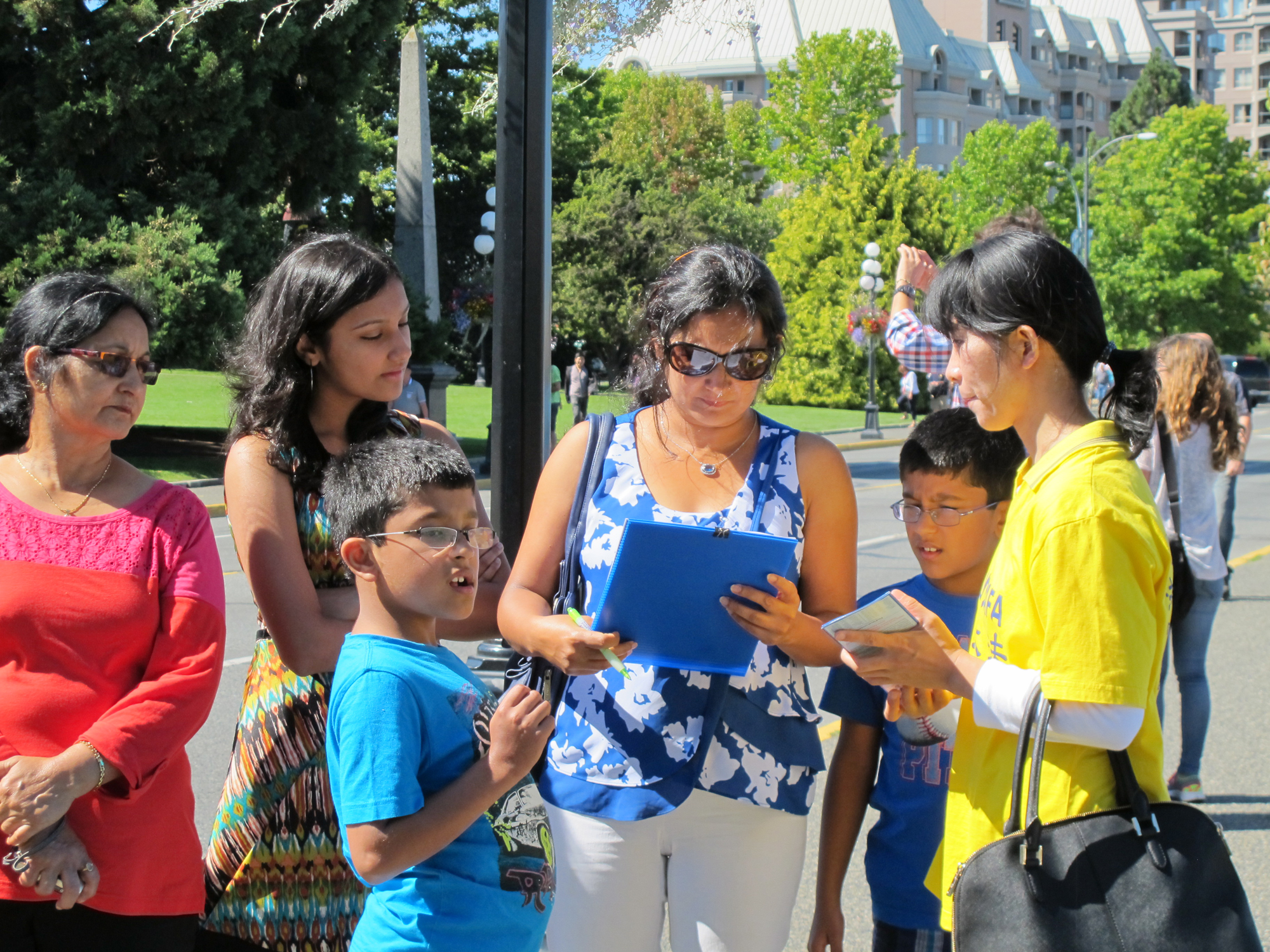 其他学员抓紧时间向行人讲真相,征签、劝三退(退出中共党、团、队)。学员于女士手里拿了五、六个征签板,穿梭于游客之间,忙得不亦乐乎。她说:“人们都签,签了好多。一个来自大陆的旅游团,象是中共干部出来玩的,都是党员,一下退了十几个。”