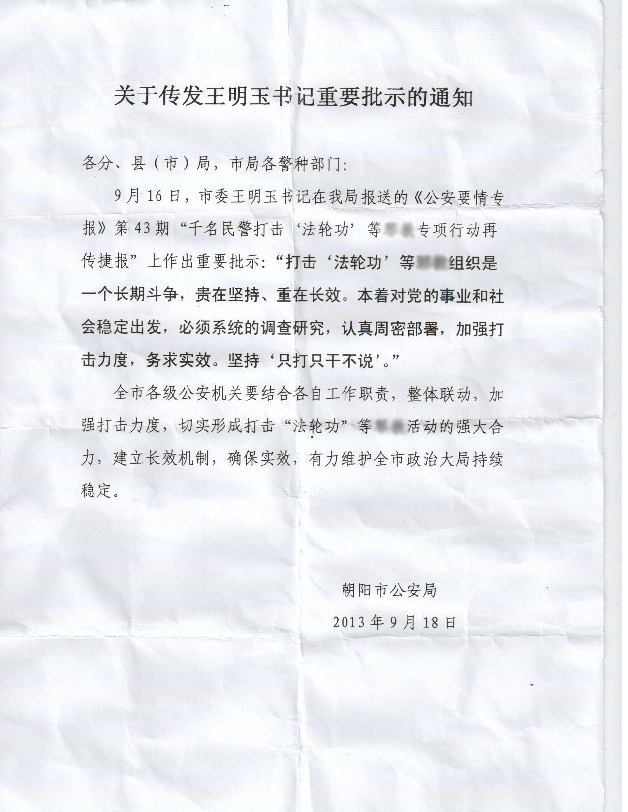 朝阳市公安局已于九月十八日将王明玉的血腥密令——《关于传发王明玉书记的重要批示》,以文字形式传发给朝阳市公安局属下的各分、县(市)局以及市局各警种部门。此文件将成为王明玉迫害当地法轮功学员的白纸黑字的自供状。