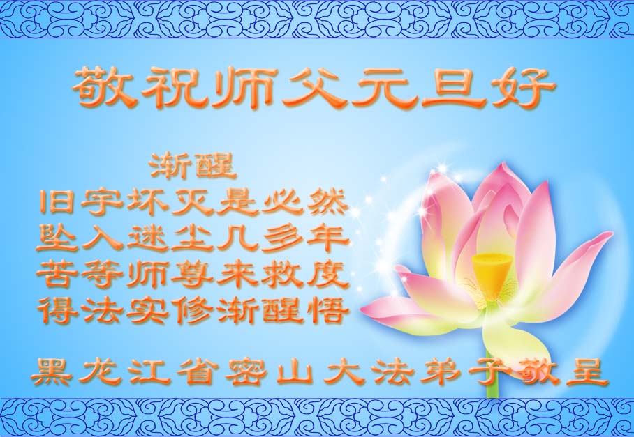 感恩师父的慈悲苦度!弟子原是一名警察,是大法彻底改变了我,使我从一个曾经对大法犯罪面临销毁的人到成为一个堂堂正正的正法时期的大法弟子,弟子在新的一年里,一定会做得更好,踏踏实实修好自己,多救人,兑现自己的誓约。