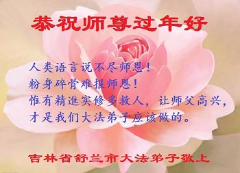 我们这个家族共七个家庭三十余口人。自从明白大法真相之后,我们就毅然退出了中共的党团队邪教组织,远离邪恶,保护救人的大法弟子,并且在平时顺应大法“真、善、忍”的标准行事,尽量多做好事,不做那些缺德事,托大师的福,我们家家都多次受益,上班的工作顺利,经商的买卖兴隆,上学的成绩优秀,最近几年,家族中出了六个研究生,家家幸福平安,人人健康愉快。我们对李大师非常敬仰,非常感激!特在中华传统节日新年到来之际,给尊敬的李大师拜年!祝李大师新年愉快!谢谢李大师!