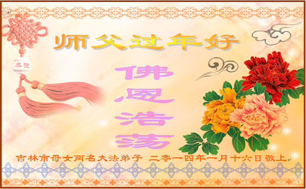 我母亲修炼,我们就得到了李大师的保护和恩泽。在此我们怀着无限敬意心情,向无限慈悲的李大师说一句:“李大师:过年好!我们向您拜年了!我们会一如既往的支持母亲的修炼大法,支持母亲做好三件事,叩谢大师的恩泽和保护!”