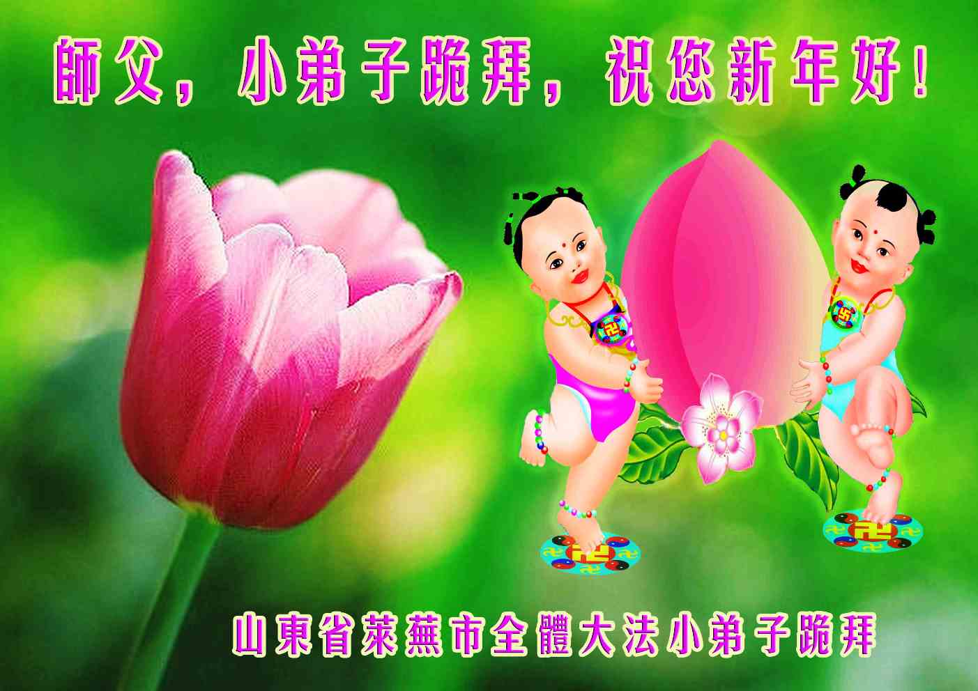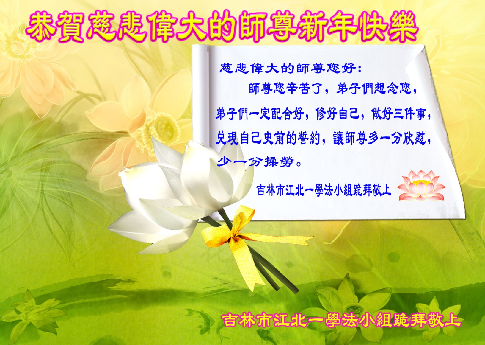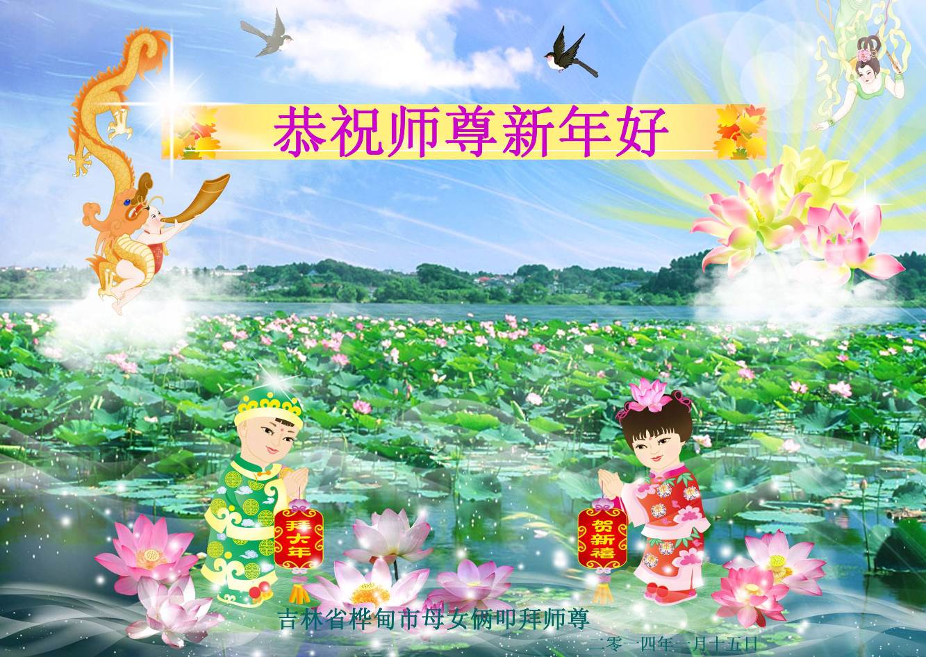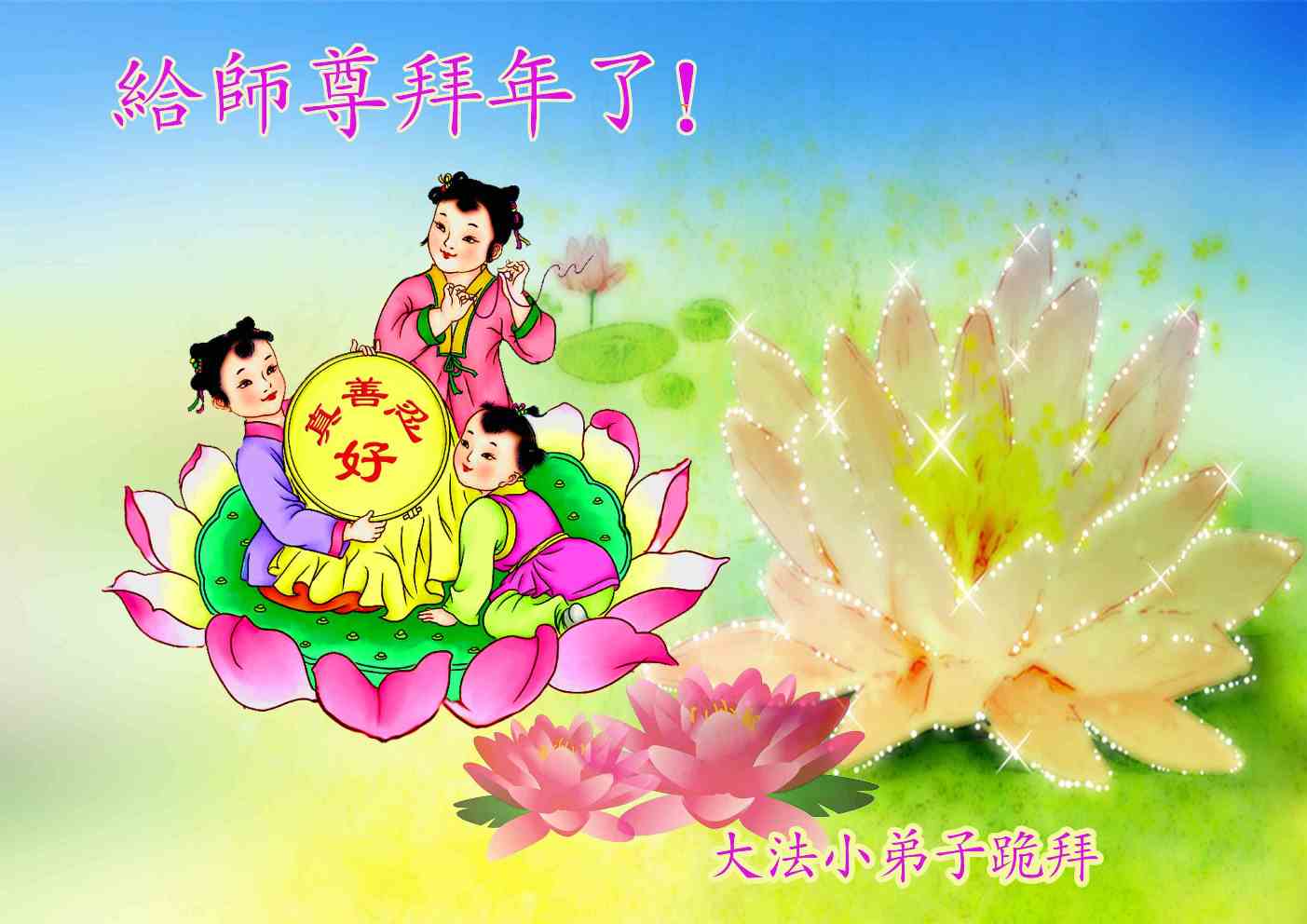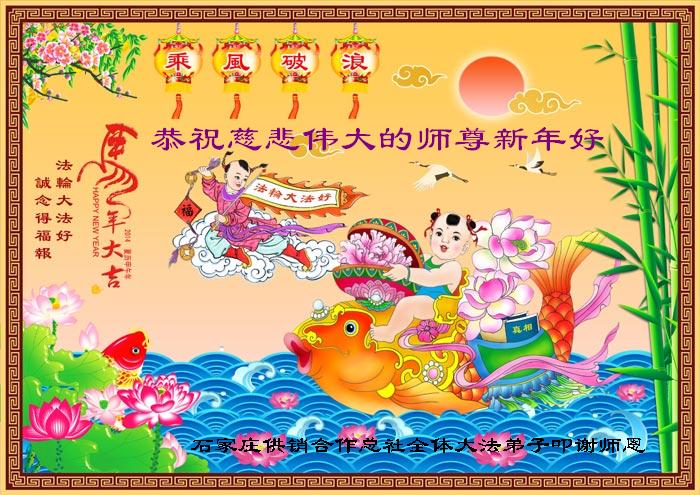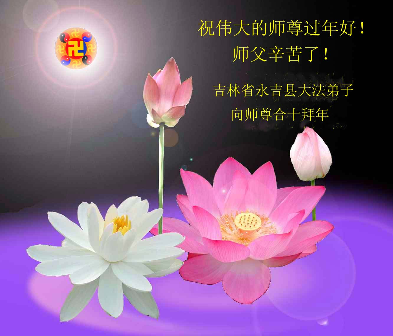 在甲午年新年到来之际,弟子们给师尊拜年了!弟子们按照师尊的要求,坚持多学法、学好法、用心学法,认真做好三件事。在师尊的慈悲呵护下,正念正行又平稳的度过了一年。在新的一年里,我们要更加努力的多学法,学好法,整体配合好,遇到问题向内找,正念正行做好三件事,完成我们的史前大愿,随师尊回家。