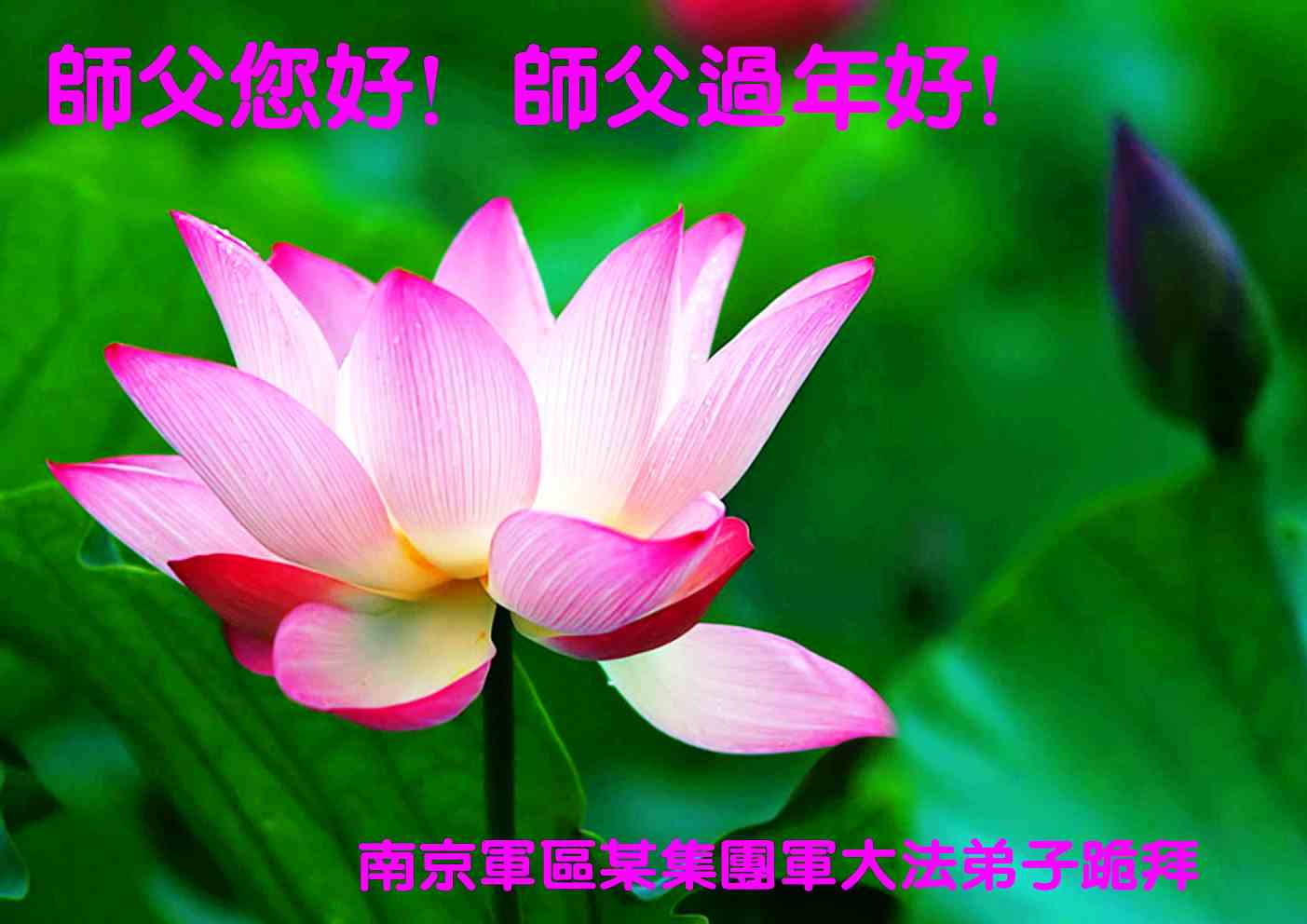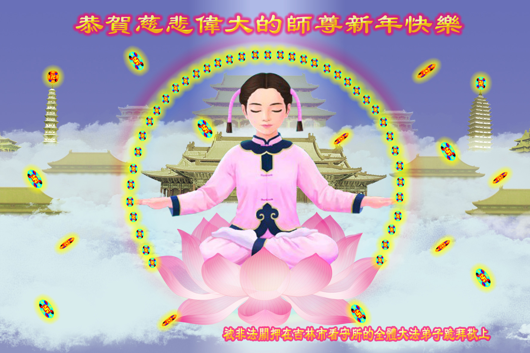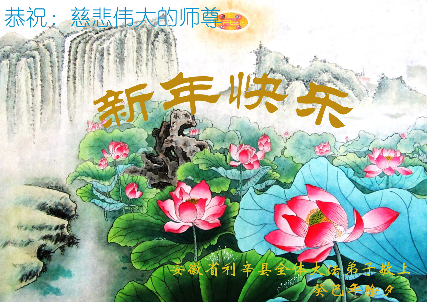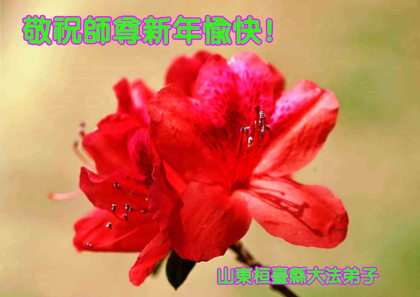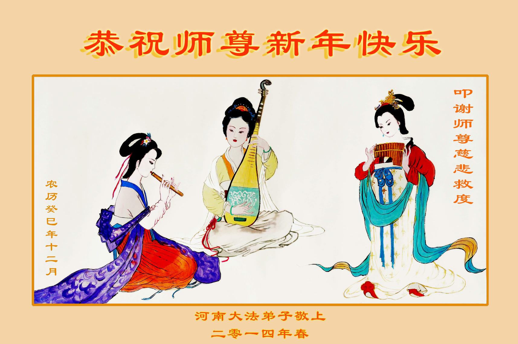 在甲午年新年到来之际,弟子们给师尊拜年了!弟子们按照师尊的要求,坚持多学法、学好法、用心学法,认真做好三件事。在师尊的慈悲呵护下,正念正行又平稳的度过了一年。在新的一年里,我们要更加努力的多学法,学好法,整体配合好,遇到问题向内找,正念正行做好三件事,完成我们的史前大愿,随师尊回家。