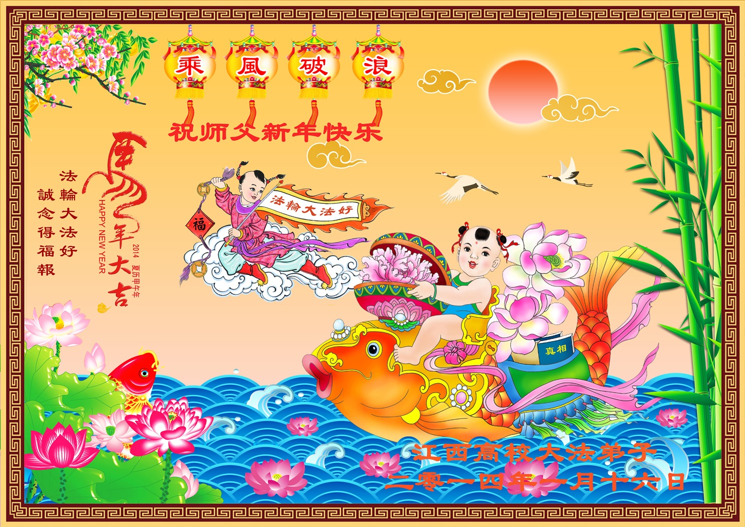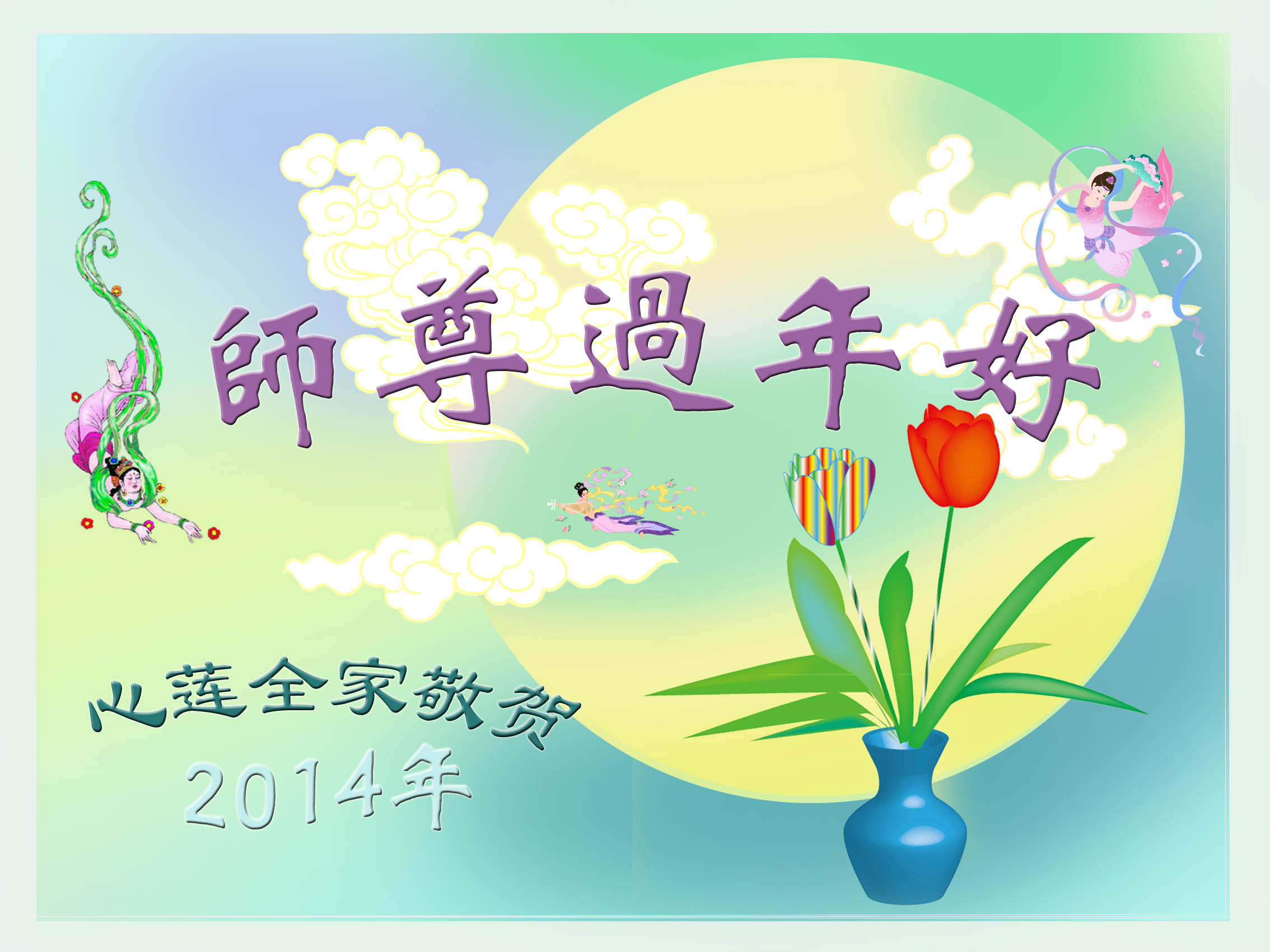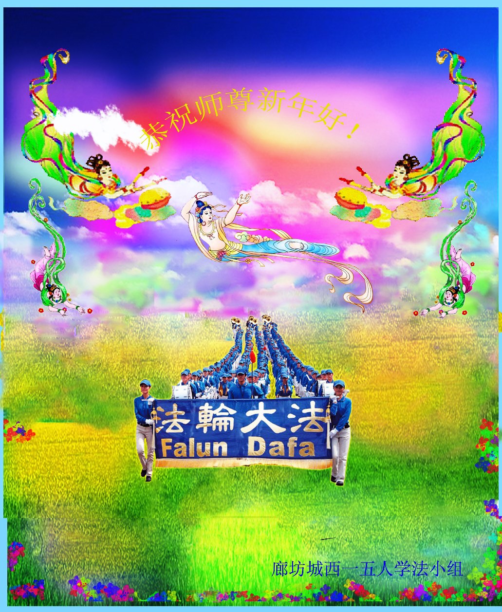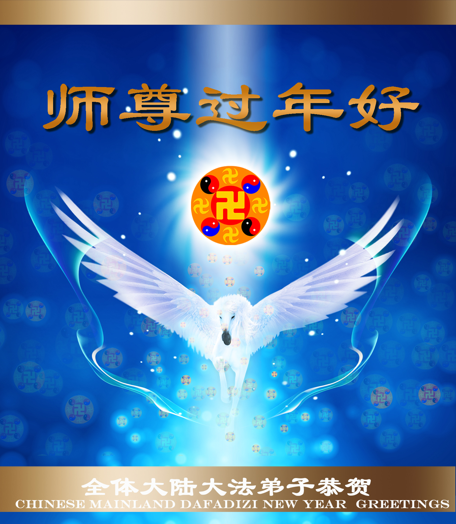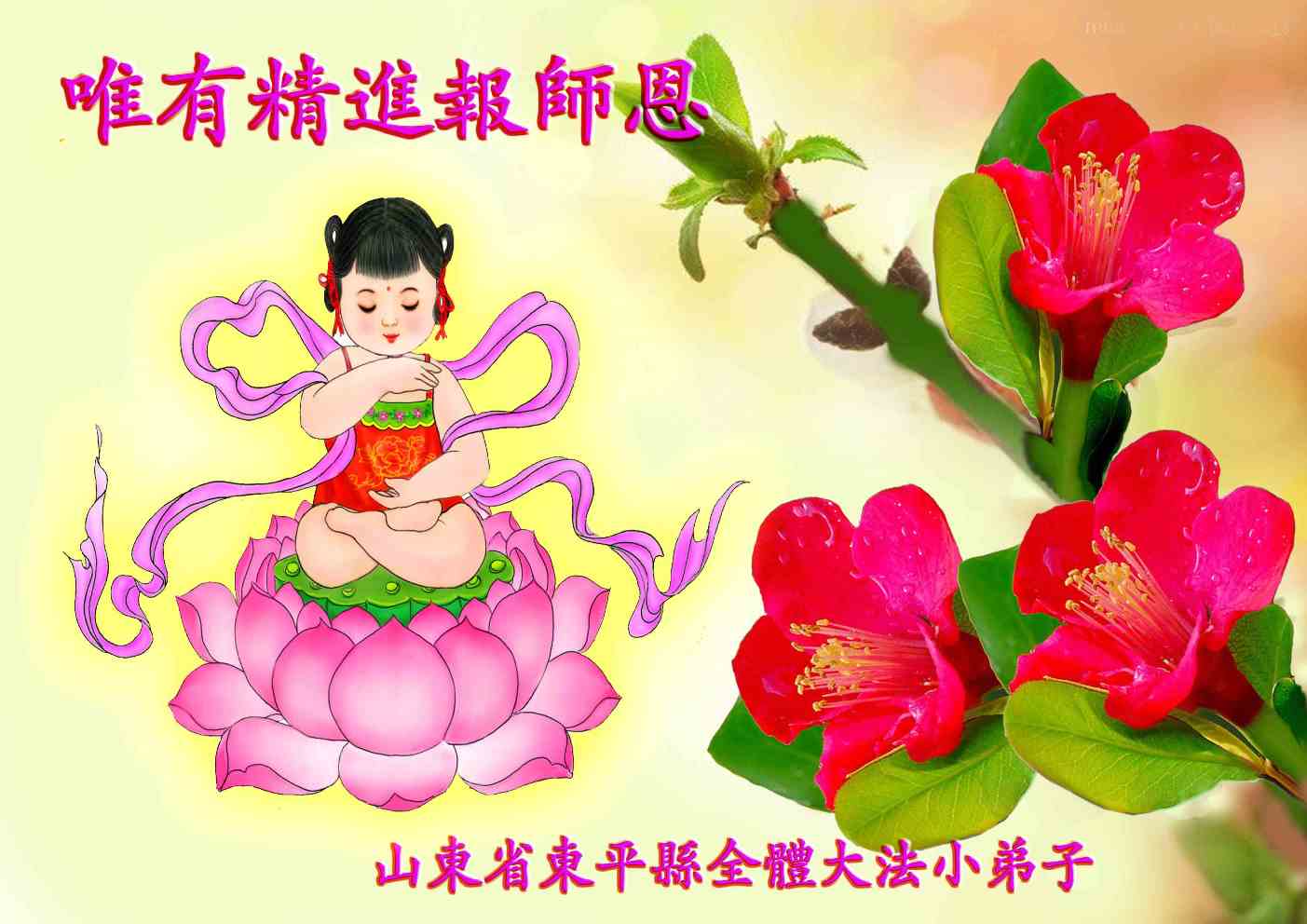 在甲午年新年到来之际,弟子们给师尊拜年了!弟子们按照师尊的要求,坚持多学法、学好法、用心学法,认真做好三件事。在师尊的慈悲呵护下,正念正行又平稳的度过了一年。在新的一年里,我们要更加努力的多学法,学好法,整体配合好,遇到问题向内找,正念正行做好三件事,完成我们的史前大愿,随师尊回家。