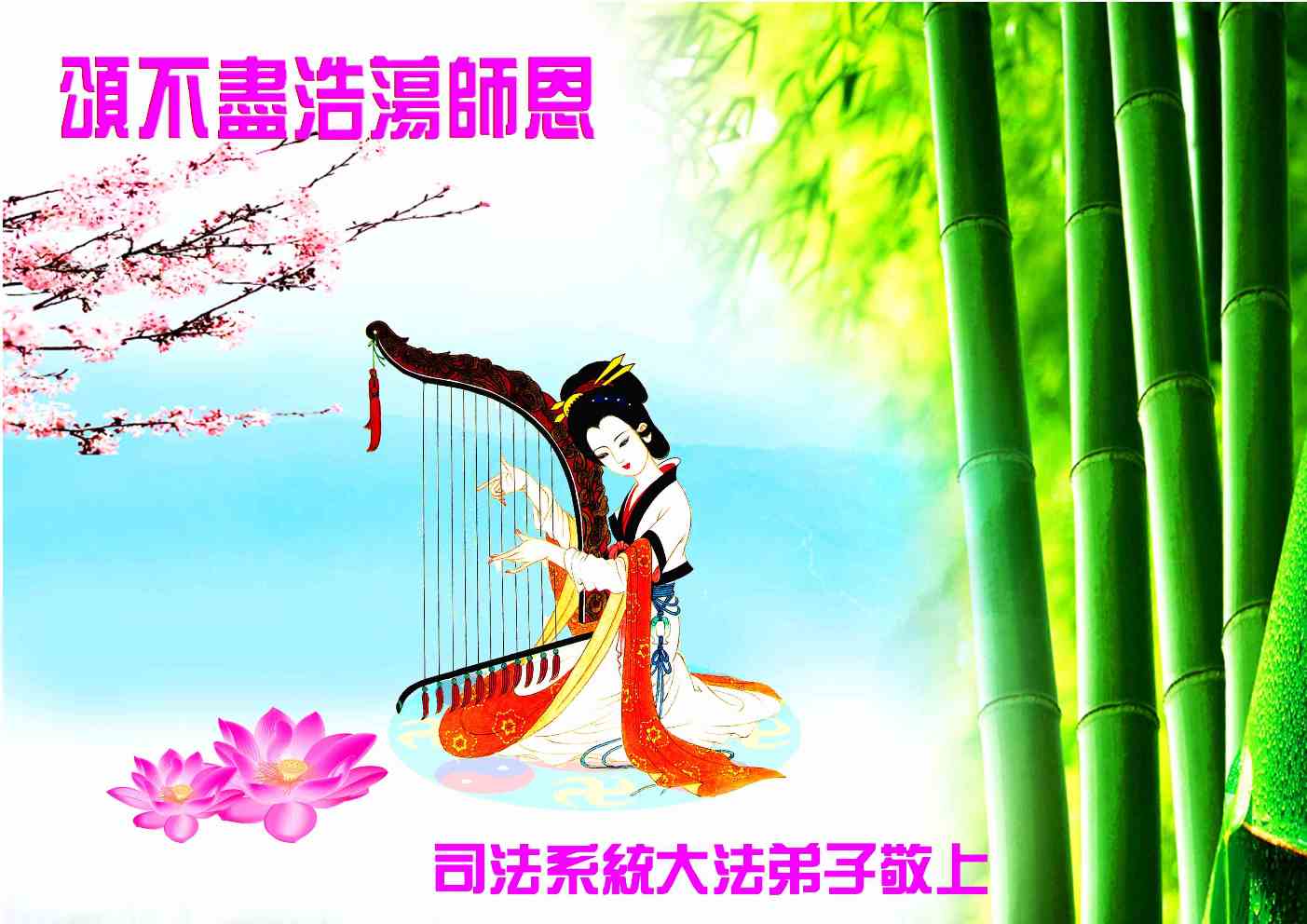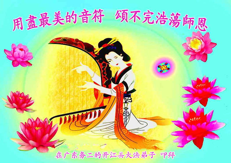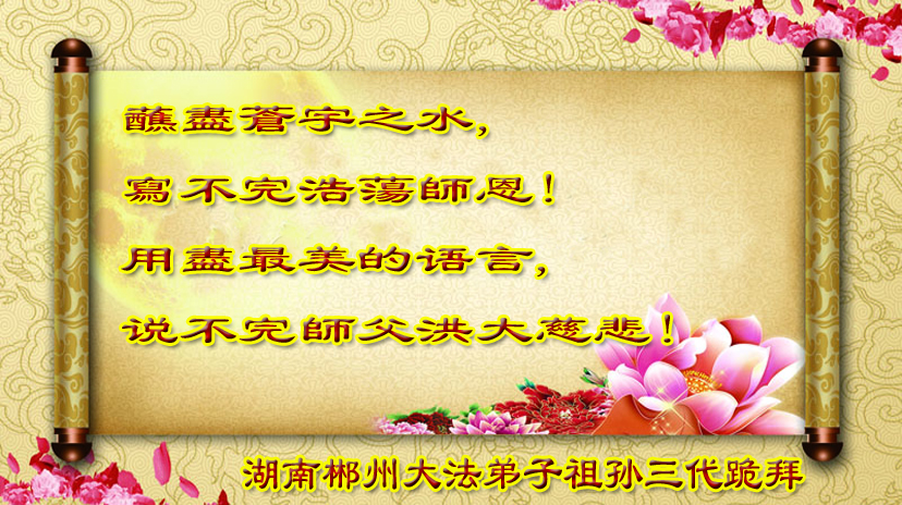 请师尊放心,我们一定在各自环境中兑现自己的承诺和使命,在法的不同层次中严格要求自己,多救众生,多铲除邪恶,学好法,在人类的舞台上演好大法弟子的角色,多多证实法,使大法弟子的威德越来越大。