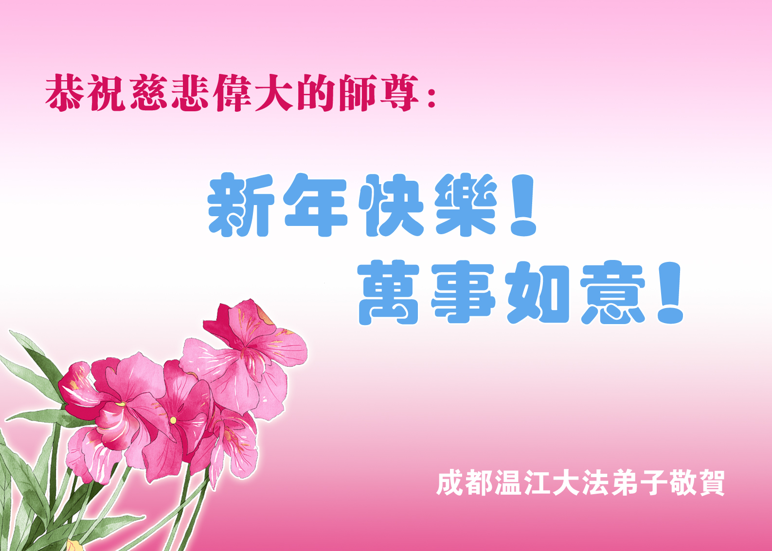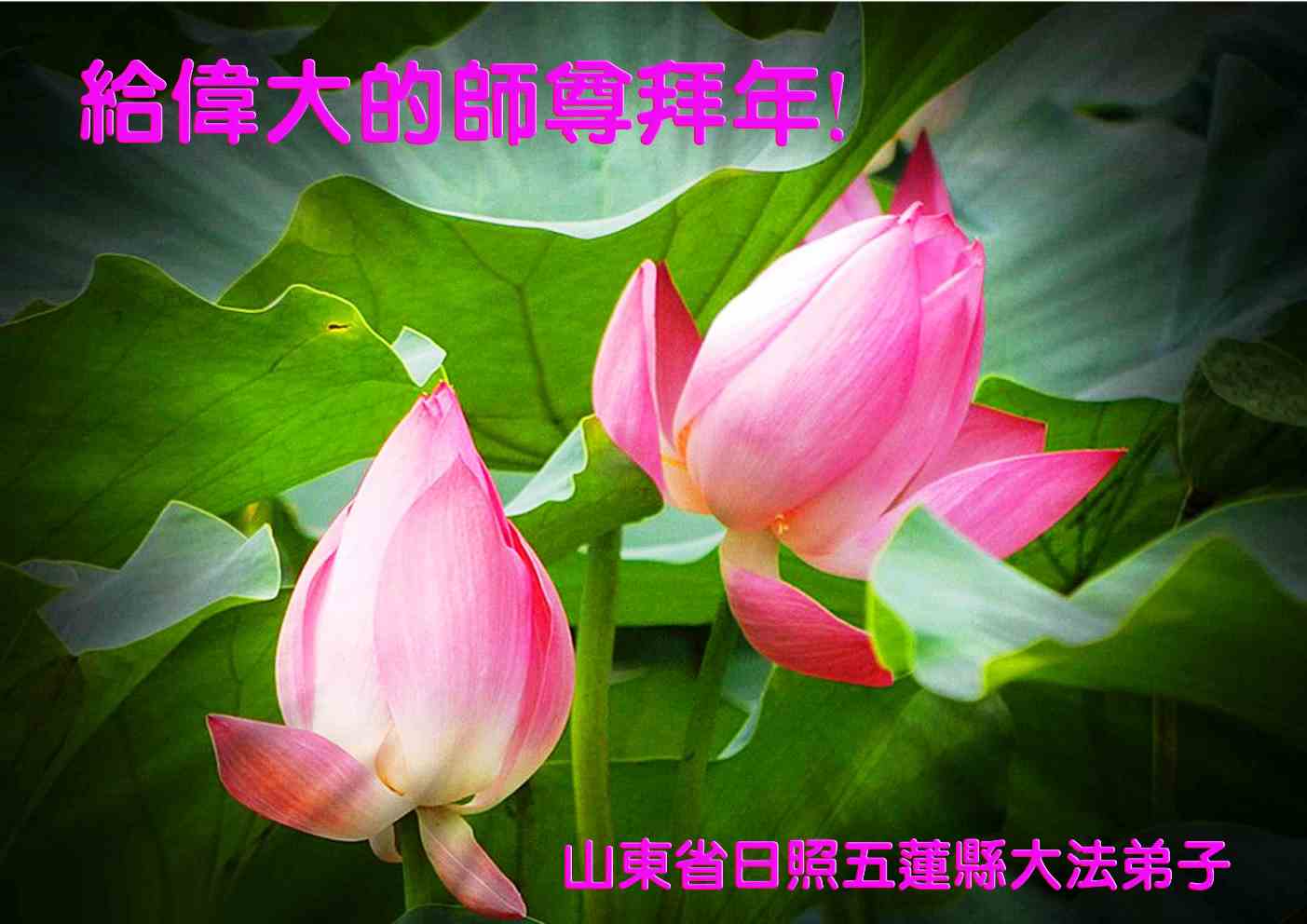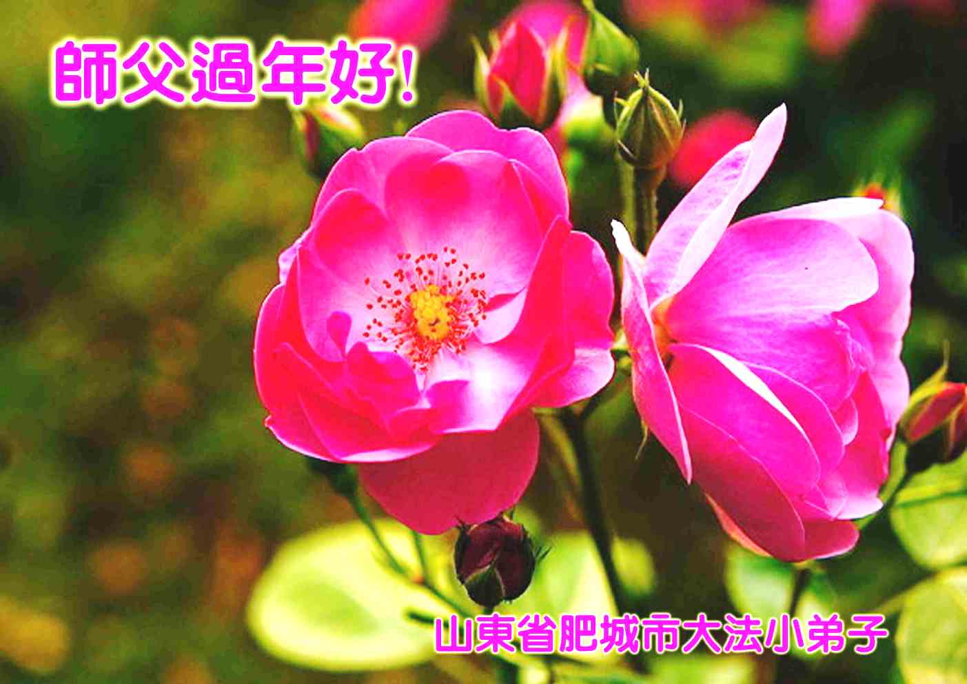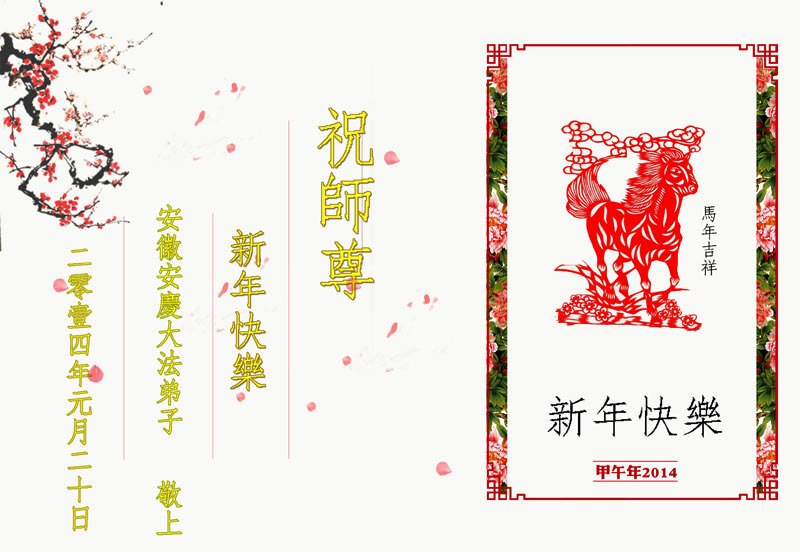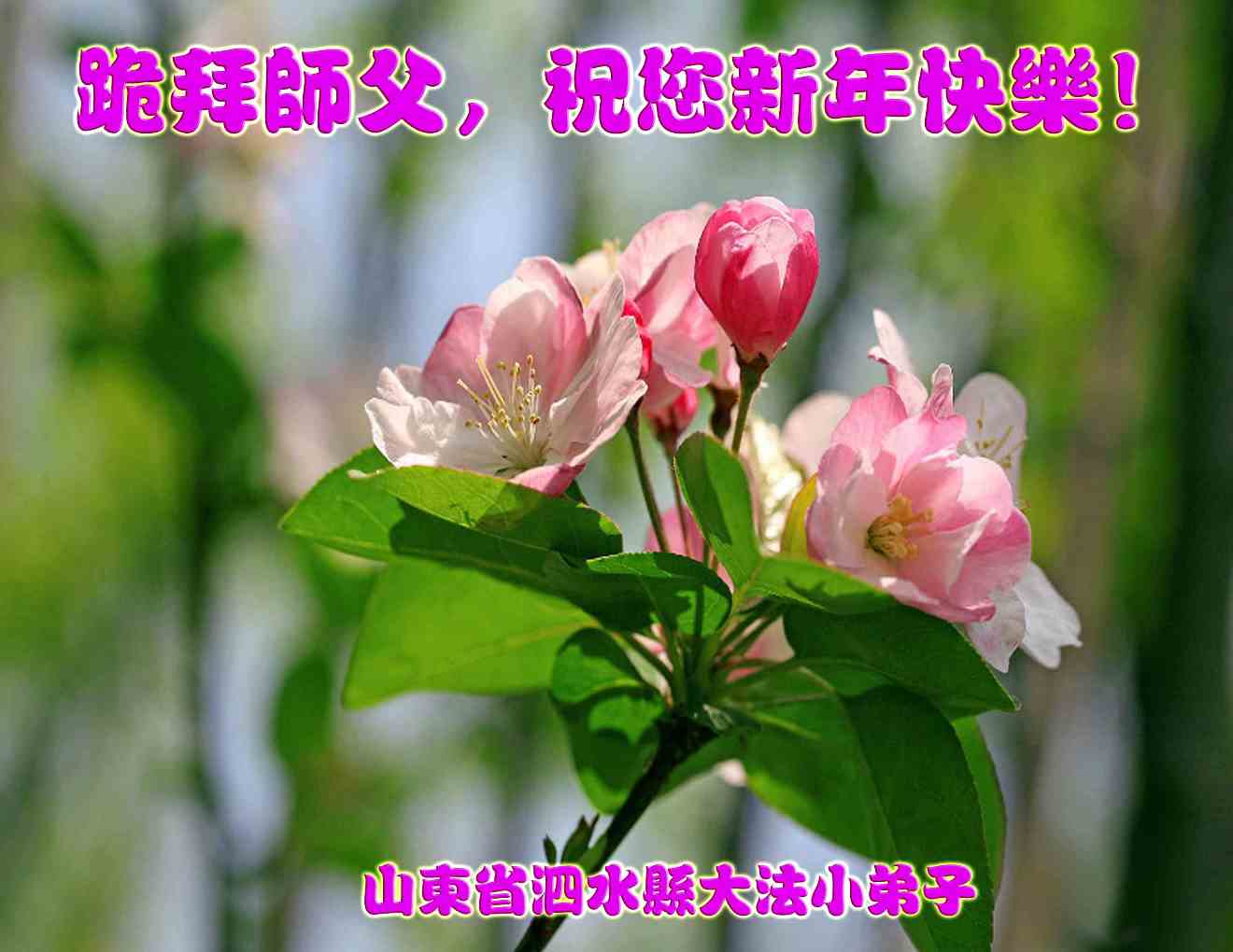 我们夫妻是09年得法的新学员,虽然我们俩在不同环境,但跟师父回家的心是一样的。在新的一年里学好法,做好三件事,修好自己,让师父少操点心,争取赶上正法進程,跟师父回家。我们夫妻跪拜:祝师尊新年快乐!