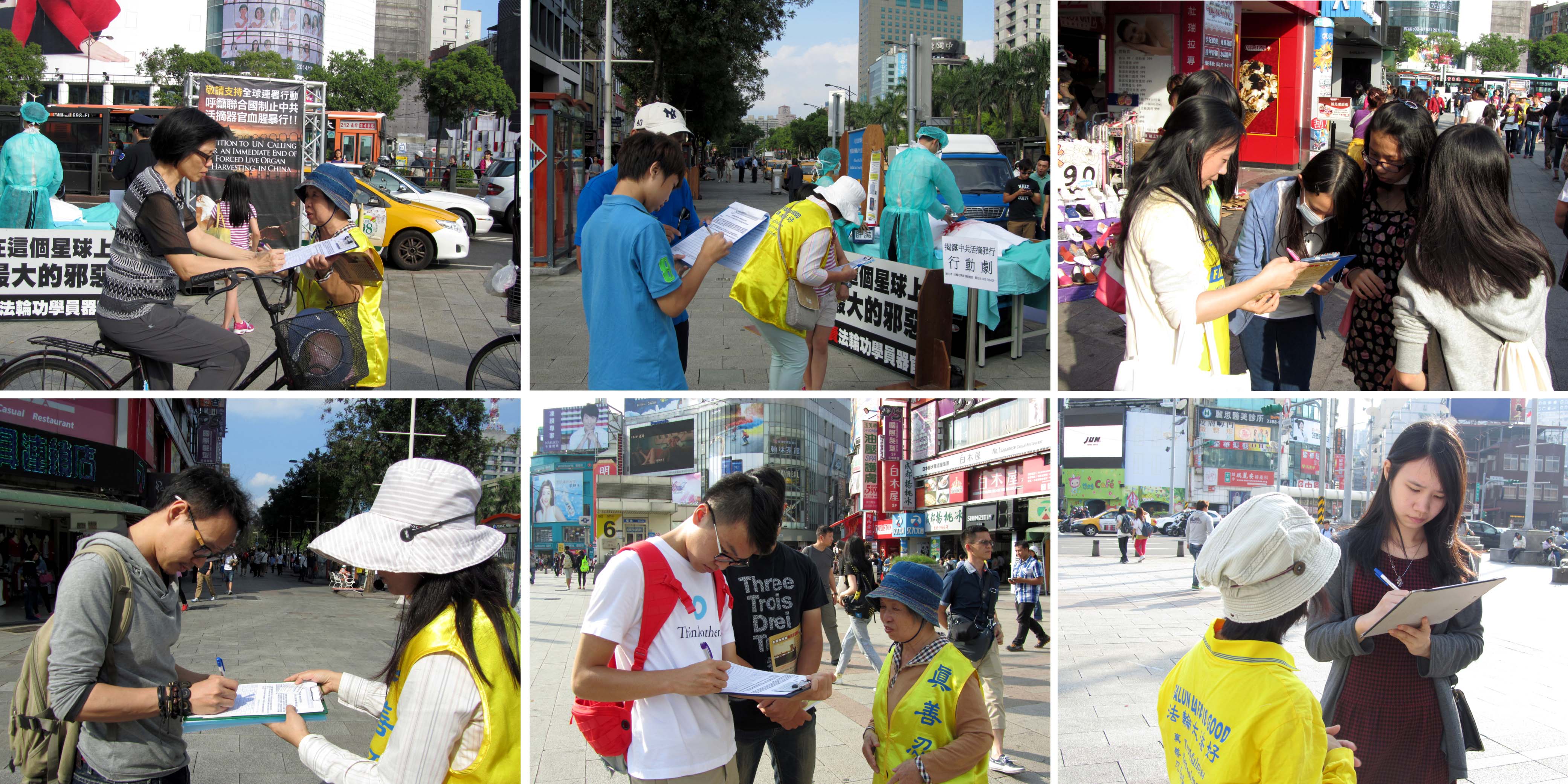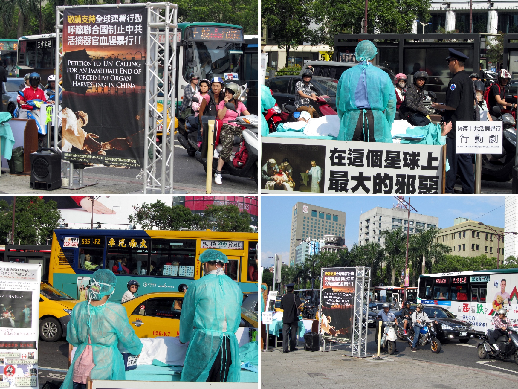 法轮功学员在西门町商城前广场、贴近中华路边的行道上,以现场的真人模拟演示剧揭露中共活摘器官贩卖图利的暴行,并向民众征签,制止中共迫害法轮功,呼吁法办江泽民、罗干、刘京、周永康等元凶。