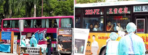 图2-3:“中共活摘法轮功学员器官”模拟演示行动剧吸引车上乘客、摩托车骑士以及熙来攘往的民众聚焦注目。