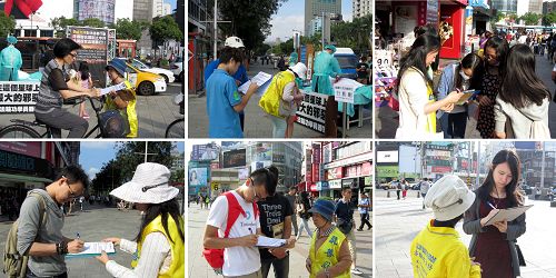 鲜明的展板诉求和演示行动剧,吸引车上乘客、摩托车骑士以及熙来攘往的民众聚焦注目,有的拿起手机、相机拍摄画面,有的驻足观看、拿取真相资料,聆听学员讲解,并纷纷签名支持正义、呼吁制止中共的血腥暴行。法轮功学员们不时听到民众说:“辛苦了!加油!”的鼓励。