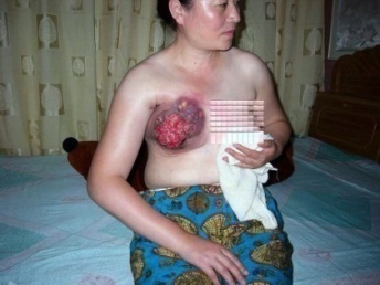 ![]() 法轮功学员王云洁,她的乳房被长时间电击,致使整个乳房溃烂 |