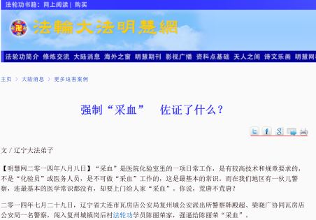 最近明慧网曝出:2014年7月29日,大连市瓦房店公安局复州城公安派出所警察韩殿超、梁晓广协同瓦房店公安局一名警察,闯入复州城镇岗后村法轮功学员陈丽荣家,强逼给陈丽荣“采血”。闯入家门,逼迫采血,当然不是为了体检,那究竟为什么要“采血、验血”呢?毫无疑问,采血是为了获取法轮功学员身体器官和血型的信息。我们震惊的是:时至今日,中共居然摘下面具,公然闯入学员家中,为了活摘器官,逼迫学员“采血”。