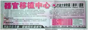 4. 大连《新商报》2006年12月29日报道,大连大学附属新华医院两个小时实施三例肾脏移植手术。该三例肾脏移植手术是当天通过沈大高速公路,有人将刚刚摘取到的肾源送到后盐收费口,然后,三个肾源被转移到早已守候在此的救护车上。14时40分,救护车在大连大学附属新华医院门前停下,医护人员将箱子运到手术室,实施手术。