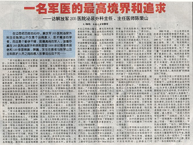 二零零六年五月二十三日的《辽西商报》B4版上刊登了一篇介绍任锦州市解放军205医院泌尿科主任、主任医师陈荣山的报导,文中介绍了陈荣山近年来“共完成肾移植手术高达568例,成功率达到100%,一年肾成活率高达98%左右,均达到了国际先进水平。其专业技术在辽西独占鳌头。慕名而来的患者络绎不绝,吸引着我国台湾地区和来自新加坡、韩国、马来西亚等地的患者。” 据内部可靠消息证实,该泌尿科现在大约一周左右就能为患者找到活体供源。