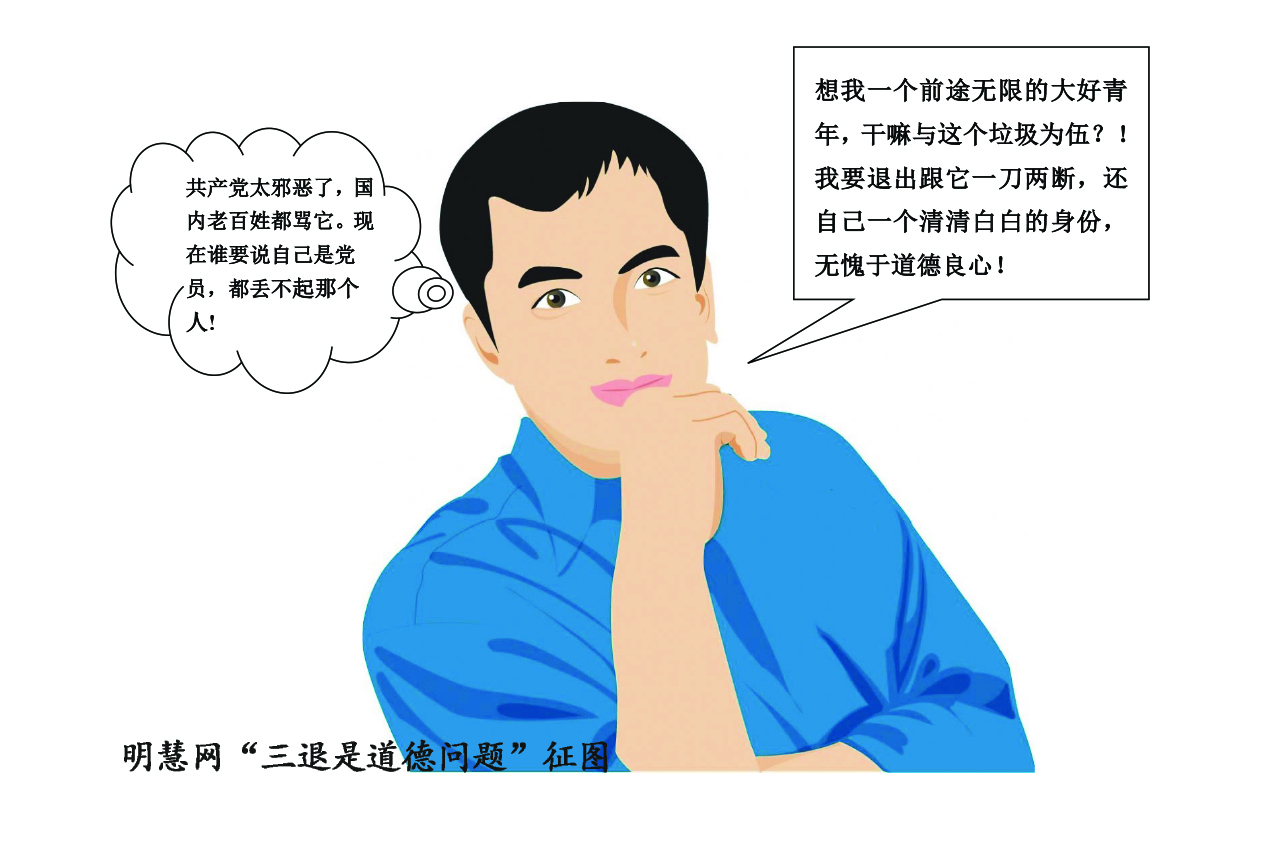 “共产党太邪恶了,国内老百姓都骂它。现在谁要说自己是个党员,都丢不起那个人!”“想我是一个前途无限的大好青年,干嘛与这个垃圾为伍?!我要退出跟它一刀两断,还自己一个清清白白的身份,无愧于道德良心!”