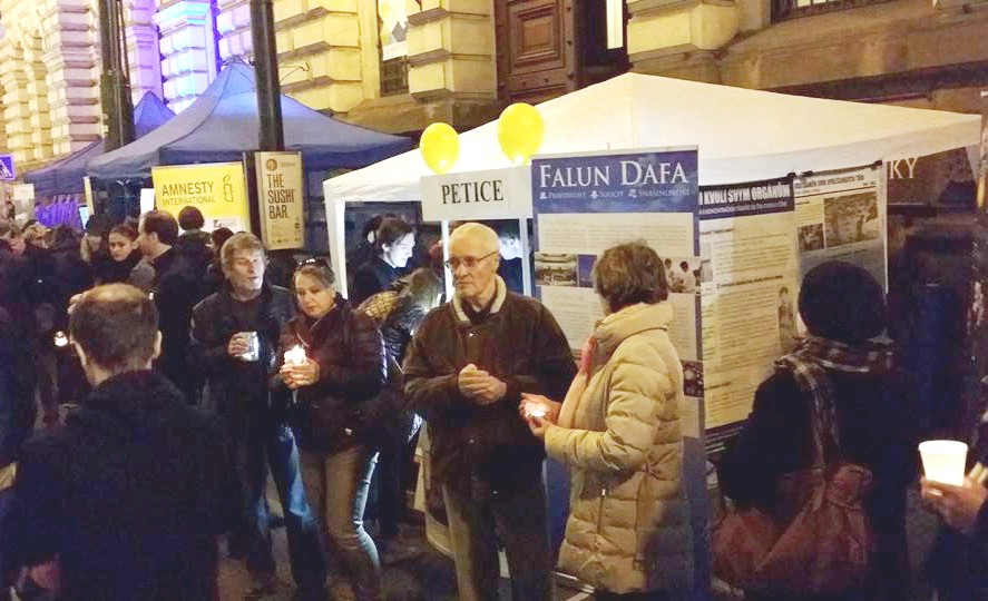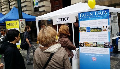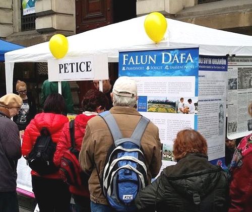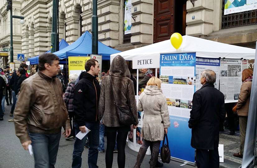信息摊位还来了很多其它国家的游客,他们中有的从他们自己国家就知道了迫害,他们很高兴在捷克这个共产党倒台的特殊日子里,签字制止迫害。