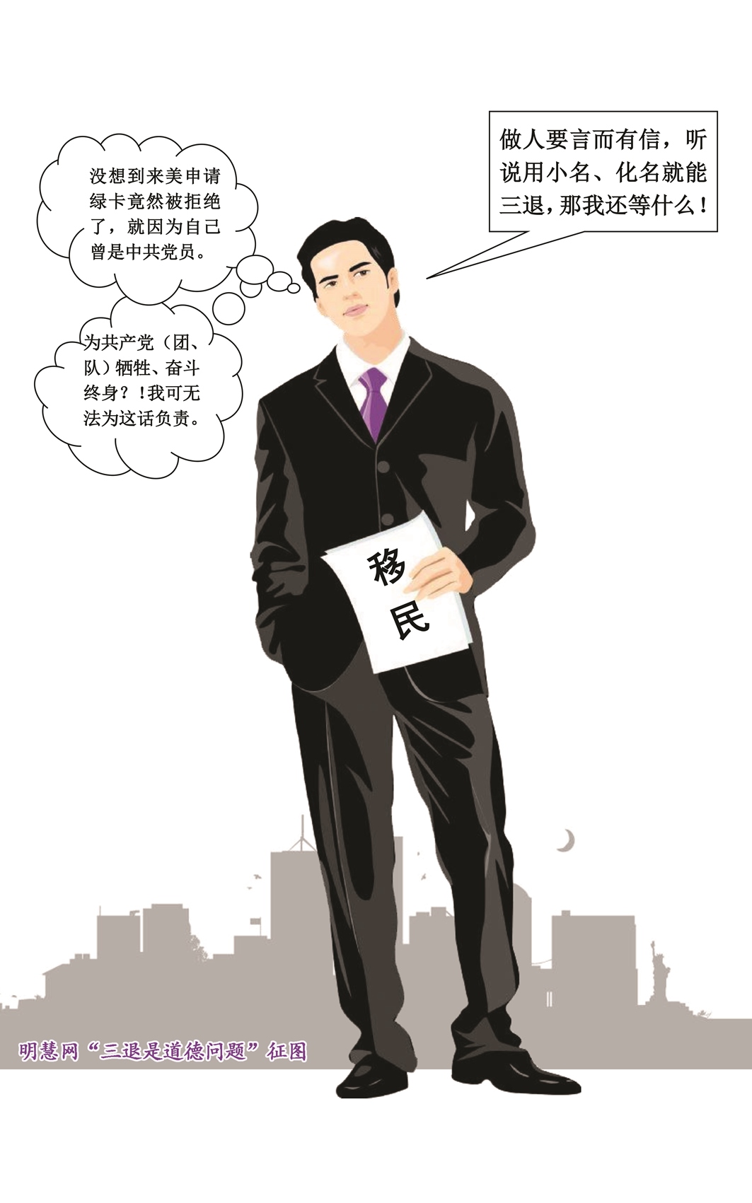 “没想到来美申请绿卡竟然被拒绝了,就因为自己曾是中共党员。”“为共产党(团、队)牺牲、奋斗终身?!我可无法为这话负责。”“做人要言而有信,听说用小名、化名就能三退,那我还等什么!”