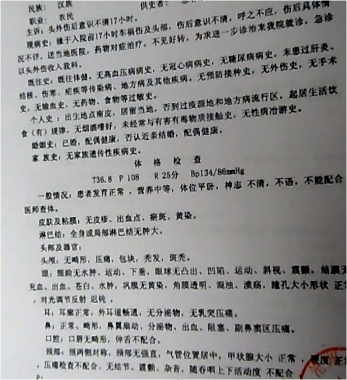 等到了南皮县医院检查结果显示:脑部11处骨折,胳膊多处骨折,颈椎严重损伤,肋骨挫伤插伤肺部,眼眶骨折,眼球线也断了,牙床撞折还掉了一颗牙。医生看结果后就通知我们说:人已经不行了。