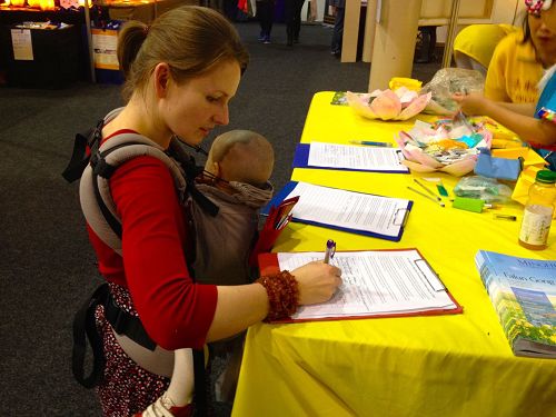 当天参加健康展的许多人经过法轮功展位时,都被法轮功功法的宁静祥和所打动,很多人在听闻法轮功被中共非法打压以及中共活摘法轮功学员器官牟利时,纷纷在反迫害及反活摘器官的征签表上签名。
