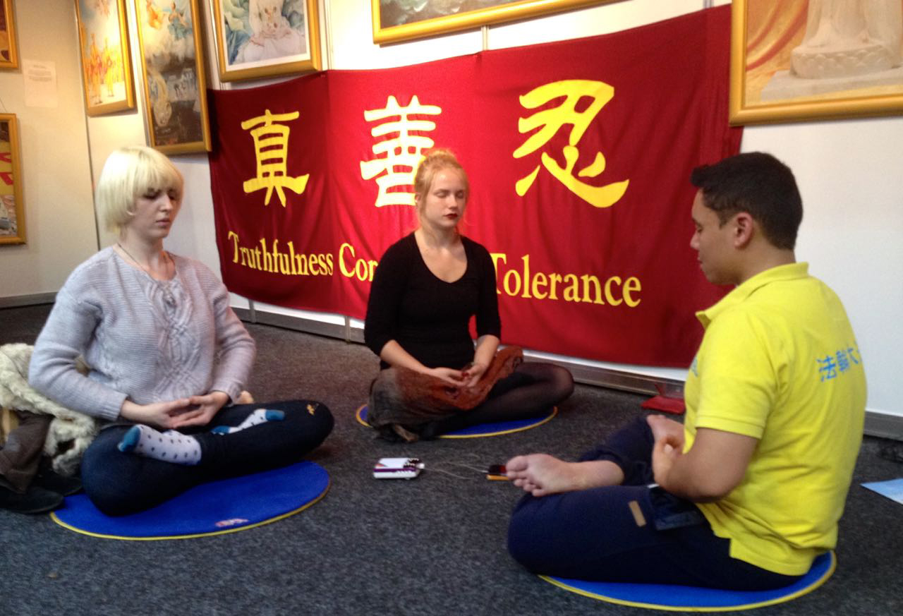 不少来来往往的看展人群当场学功。在都柏林一家医院上班的诺兰为工作压力所苦,身体时常感到酸痛。在当场学炼了法轮功四套功法后,诺兰觉得身体非常轻鬆,她表示学功时能感受到手中温暖的能量。诺兰高兴地表示回去后要对法轮功有更深的了解。