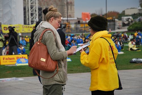 法轮功学员及支持者于二零一四年十一月四日(周二)在首都渥太华国会山集会,赶在总理十五日下午两点离开前提出诉求:要求总理此行帮助制止在中国发生的迫害。数名国会议员到场支持法轮功。