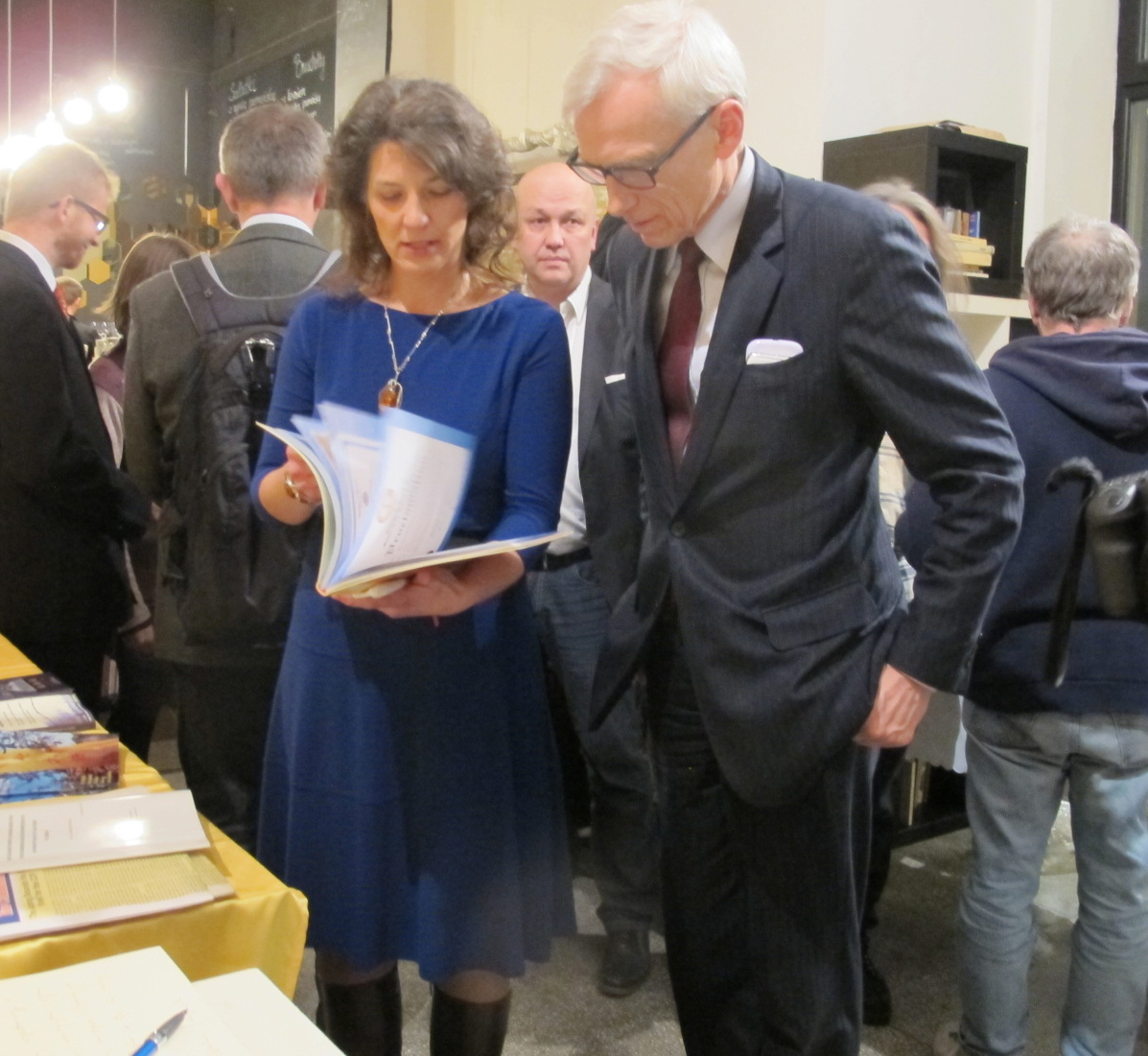Marcin Święcicki议员观看和倾听对真善忍国际美展画册的介绍
