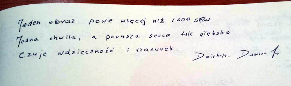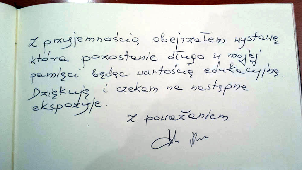 Marcin Święcicki先生临走时在留言簿上还写道:“谢谢能有机会看到这么动人的画展,它讲述了有那样一些人遭受到如此可怕的迫害,只因信仰美好的理念和忠实自己的观点。”