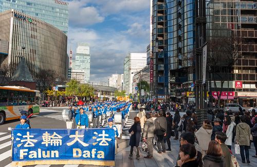 二零一四年十二月二十一日,日本东京的法轮功学员举行游行,呼吁制止中共对法轮功的残酷迫害,同时向日本民众传递法轮大法真相,传播真善忍福音。