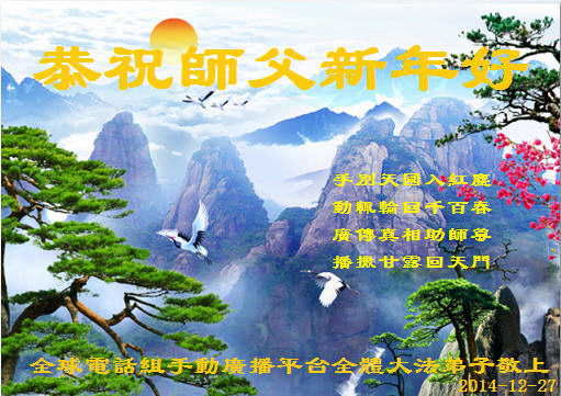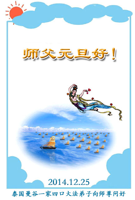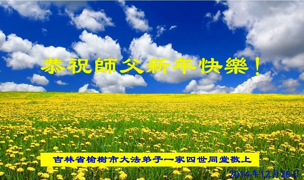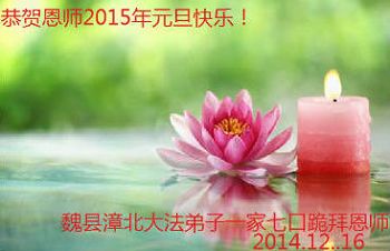 师尊您好!弟子携全家共四位大法弟子叩拜师尊!弟子一定在2015年新的一年修炼如初,共同精進,多救众生,做到:用心、救人、修炼。让师尊多一些欣慰。