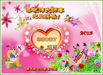 尊敬的师父您好!时光飞逝,新的一年转眼又到来了。在二零一五年元旦,全体法国大法弟子向慈悲伟大的师父问好!